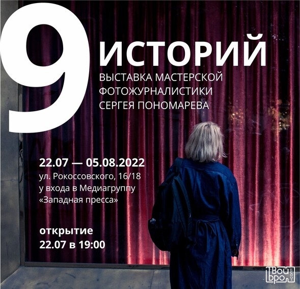 С 22 июля по 5 августа 2022 года на площадке перед входом в Медиагруппу «Западная пресса» (Калининград, ул. Рокоссовского, 16/18) пройдет выставка «9 историй» — истории девяти калининградцев глазами начинающих и профессиональных фотожурналистов. 6+