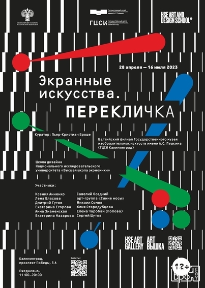 Балтийский филиал ГМИИ им. А.С. Пушкина открывает культурно-просветительский проект «Экранные искусства. Перекличка». Проект осуществлен совместно со Школой дизайна НИУ ВШЭ в рамках программы филиала «Молодое искусство», направленной на поддержку и повышение уровня мастерства художников нового поколения.
