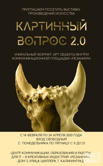 Надеемся, что наша новая площадка станет для них стартом в мир Sotheby's и мирового признания. Однако наша главная цель — представить «Картинный вопрос 2.0» максимально большему числу зрителей и научить современных жителей мегаполиса делать искусство частью своей жизни. С 14 февраля пространства центра «Резаниум» станут мини-галереями со своим характером и атмосферой — брутальной, романтичной, умиротворенной... Живопись, графика, скульптура, предметы декоративно-прикладного искусства — все это обретет свою жизнь в реальных офисных интерьерах. Авторами произведений искусства стали девять художников Калининграда: Баева Наталья, Булычев Юрий, Верниковская Ольга, Елфимов Георгий, Елфимова Людмила, El Kartoon, Степанюк Наталья, Чепкасова Наталья Особую ценность проекту придают несколько работ маэстро Елфимова-старшего, творившего в формате соцреализма 60-70 гг прошлого века. Каждый второй четверг месяца в «Картинном вопросе 2.0» будут проходить кураторские  туры. Вас ждут: