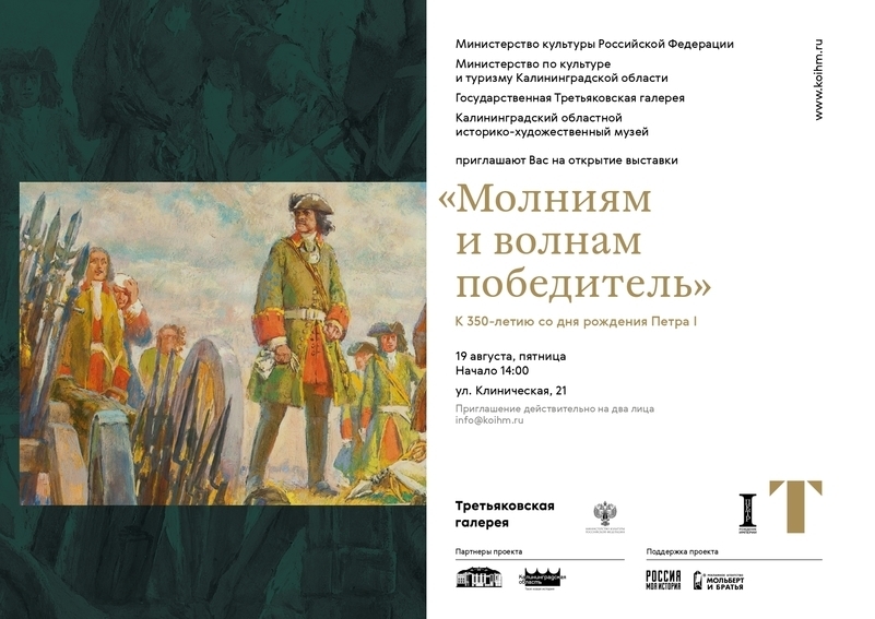 19 августа 2022 года Государственная Третьяковская галерея открывает в г. Калининграде выставку, посвященную 350-летию со дня рождения Петра I (1672–1725). Тридцать восемь произведений живописи, графики и скульптуры из коллекции Галереи расскажут о прославленных деяниях первого российского императора: завоевании выхода к Балтийскому морю, строительстве отечественного флота, а также историю морских и сухопутных сражений.