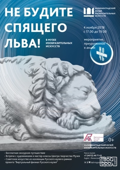 Мероприятия здесь пройдут с 17 до 19 часов, не ночью, зато к искусству могут прикоснуться и дети. Сначала по постоянной экспозиции, которая, напоминаем, посвящена львам, пройдет бесплатная экскурсия-путешествие. В других залах будут идти мастер-классы, показ советского искусства из собрания Русского музея «Гимн труду», планируется встреча с калининградским художником Виктором Рябининым. 0+