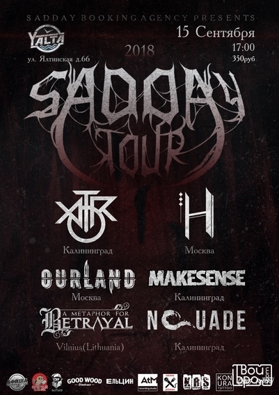 К нам в город едет фестиваль тяжелой музыки Sadday Fest! Пятнадцатого сентября в клубе Yalta обойма из шести команд из разных городов и даже стран, играющих абсолютно разную музыку, заставят раскачаться даже самого привередливого зрителя. Пачки билетов в местах продаж все тоньше и тоньше! Участники: A Metaphor For Betrayal (Vilnius), Nouade (Калининград), Ape On The Rocket (Калининград), History Of Life (Москва), Ourland (Москва), Makesense (Калининград). Стоимость билетов от 350 руб. 18+