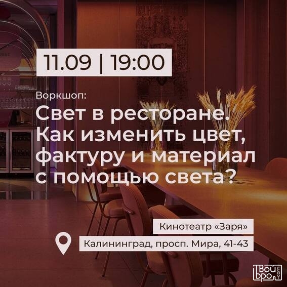 Приглашаем 11 сентября архитекторов и дизайнеров на мастер-класс в Калининграде «Свет в ресторане. Как изменить цвет, фактуру и материал с помощью света?».