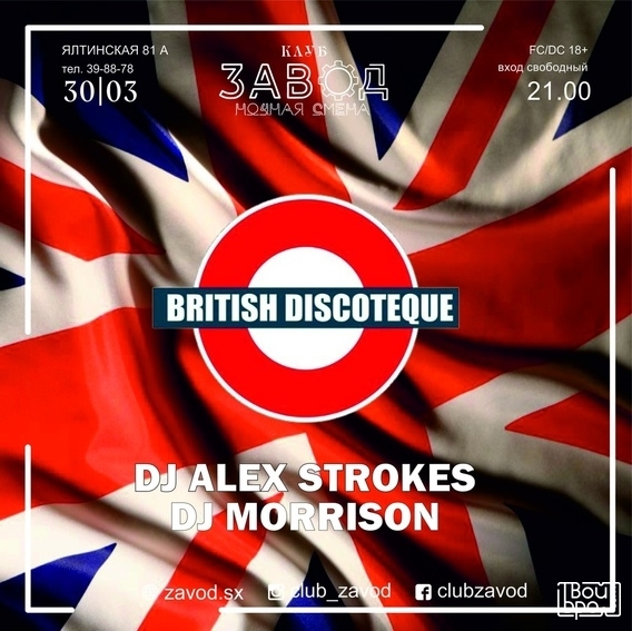 BRITISH DISCOTEQUE - легендарные вечеринки которые многие годы были самыми любимыми у посетителей клуба Вагонка, потом качевали по разным заведениям города и вот теперь будут регулярно проводиться в клубе "ЗАВОД"