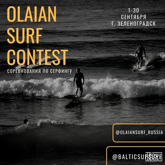 Дорогие друзья! В сентябре наша Школа серфинга и САП-серфинга в Зеленоградске Baltic Sup&Surf при поддержке Olaian (Декатлон) планирует провести любительские соревнования по серфингу в Зеленоградске Olaian Surf Contest. Соревнования пройдут в один из дней в период с 1-30 сентября 2018 г (точная дата и место будет зависеть от волнового прогноза). На момент проведения соревований, при необходимости, наша школа предоставит вам в безвозмездное пользование доску (софт) и гидрокостюм. 12+ Для участия в соревнованиях необходимо зарегистрироваться: https://vk.com/event170488161?w=app5708398_-170488161