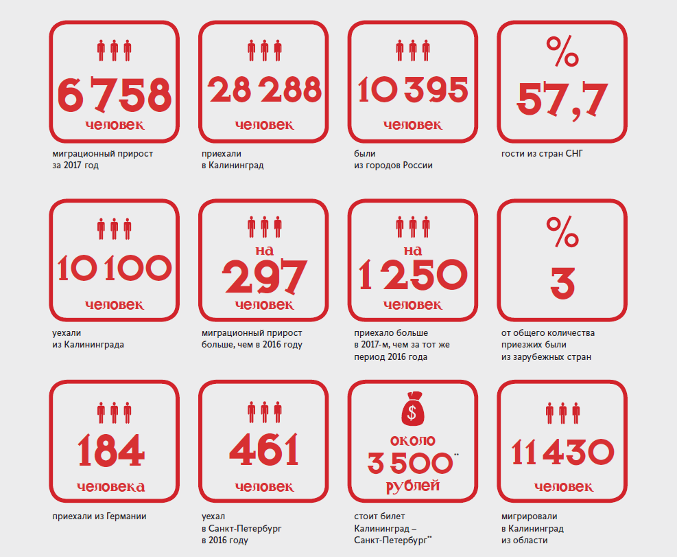 Почти 20 лет не было такого количества желающих стать жителями янтарного Эльдорадо. Но есть также покидающие или мечтающие покинуть Калининград. Мы собрали воедино все 6 частей нашей темы номера, где новые, действующие или бывшие калининградцы рассказывают, что вынуждает стать строчкой в статистике ФМС, и какие разочарования с большой вероятностью настигают в Калининграде. Также приводим вам интересные цифры