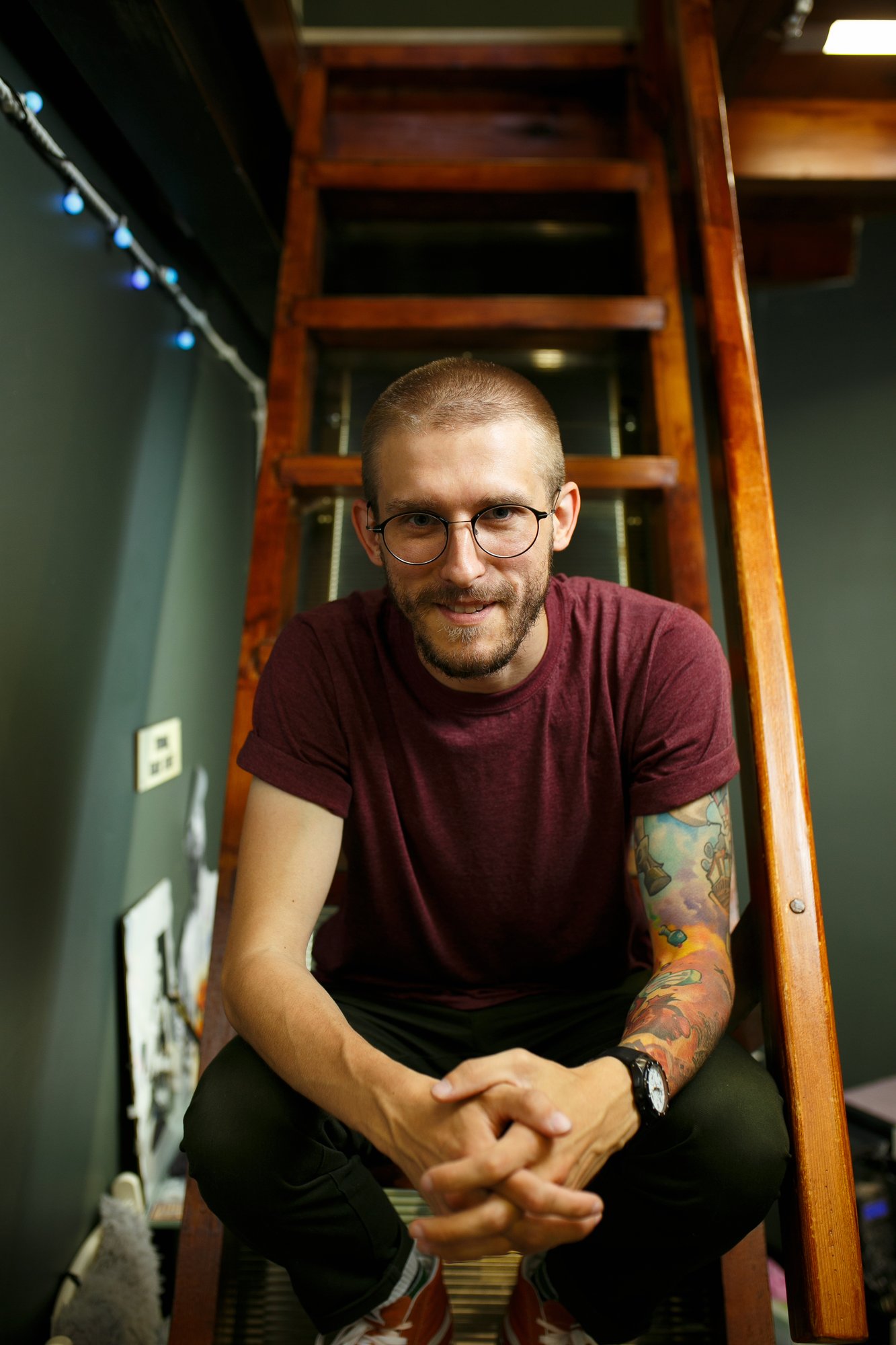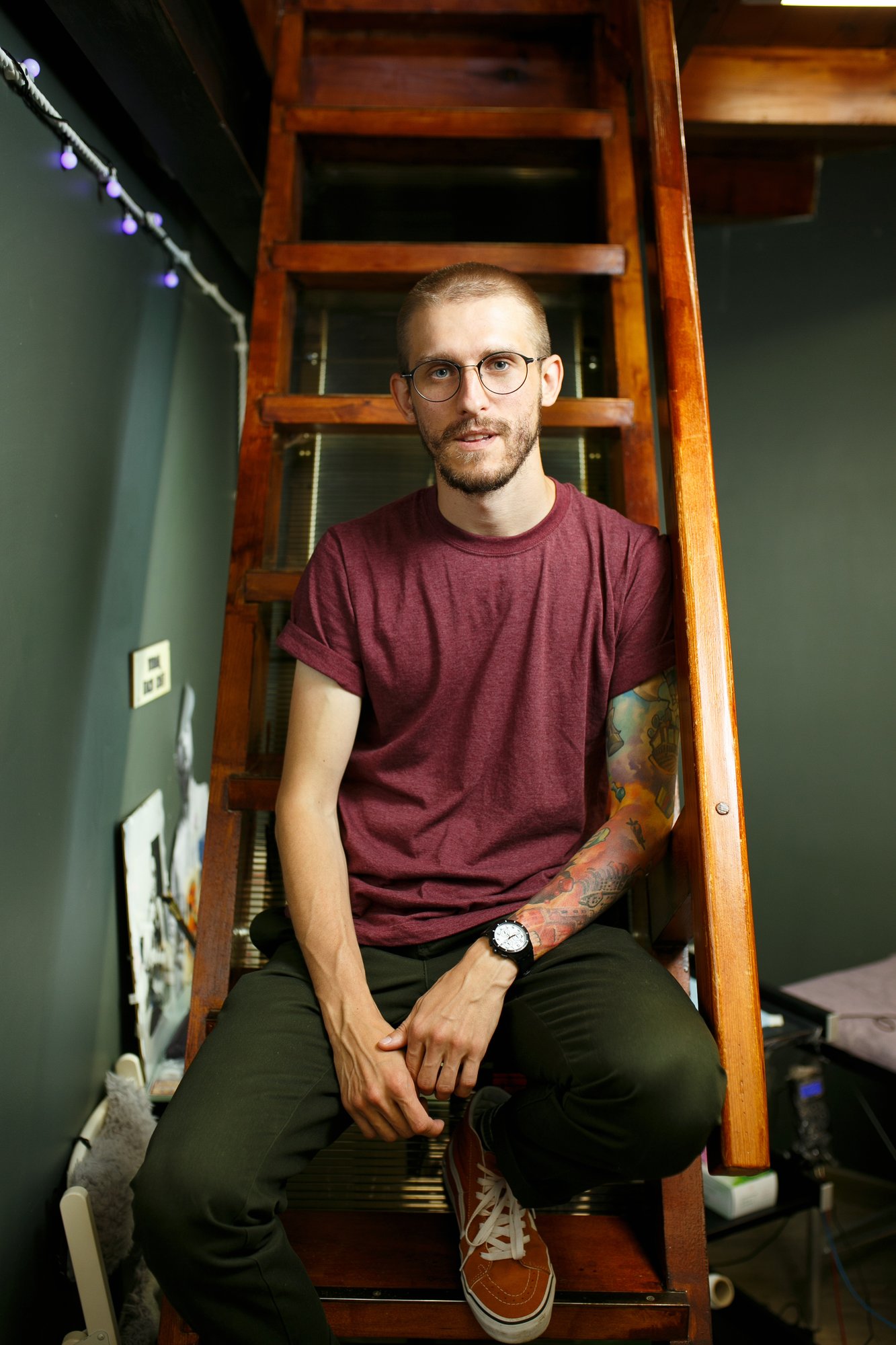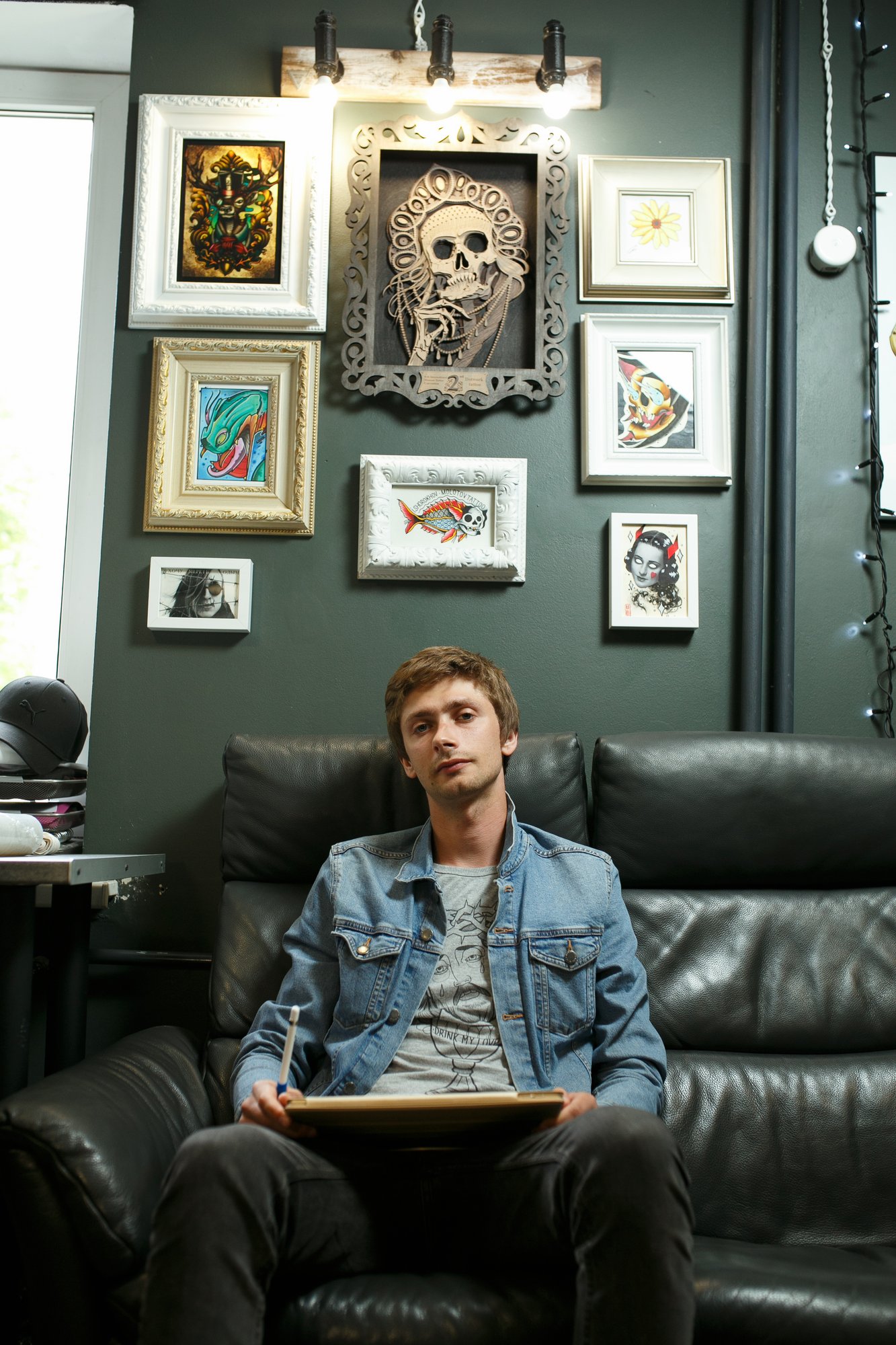 – Вся наша студия усыпана фотографиями, постерами и прочими памятными для нас вещами. На первом этаже когда-то находился барбершоп «Яппи», и, как только они закрыли эту точку, парочку вещей мы забрали себе. Буквально недавно администратор Настя спрашивает, «Ребята, почему у нас нет гирлянды?». Теперь по всему помещению у нас развешана гирлянда и царит уют. Обратите внимание, что мы чтим свою историю. Почти на входе, в стекле, у нас красуется первое расписание Молотов Tattoo, датированное августом 2011 года. Многие клиенты дарят нам подарки, так что половина открыток и прочих сувениров – любезное «спасибо» за предоставляемый нами уют.