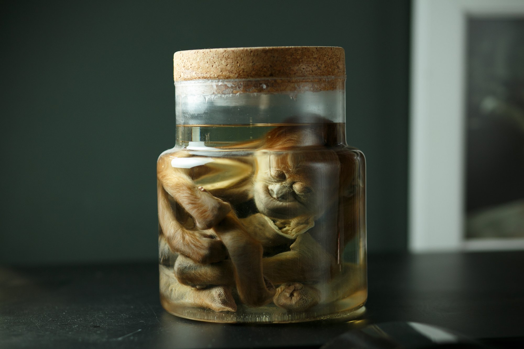 – Это – заформалиненная обезьянка, подаренная нам на открытие. У этого примата по имени Манки чуть больше конечностей, чем нужно. До этого он находился в трёхлитровой банке, которая неплотно закрывалась. Вони, как таковой, не было, но это оказалось не совсем полезно для нас. Поэтому, подсуетившись, купили банку, переселили его в новый дом, и теперь он друг нашей команды, но немой.