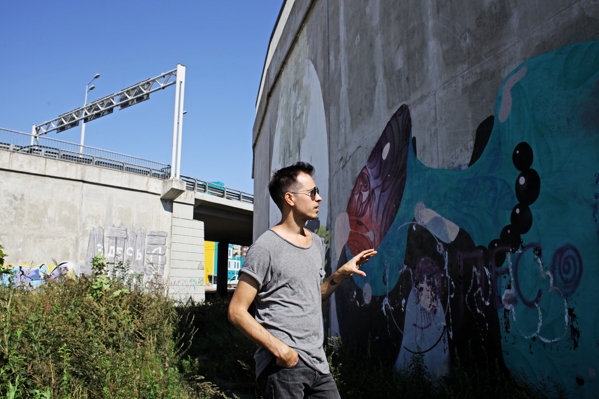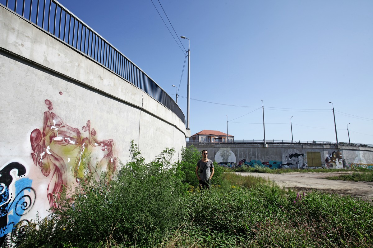 — Это был мой эксперимент над скоростью. Вот этот, самый большой, я выполнил максимум за 2-3 часа. И на каждую из работ ушло не более пары часов. Здесь я использовал в качестве кисти валик, одна деревяшка — толщина валика. Каждая работа — это манифест эгоистичности, ведь, с одной стороны, граффити не несут какой-то ценности, а с другой, именно за такой манифест собственного «я» и ценят уличных художников. Ведь самый частый вопрос «А что ты этим хотел сказать?» Да ничего, это просто эгоизм, я просто хочу видеть свои пятна, свои работы в этом месте, и это первостепенно.
