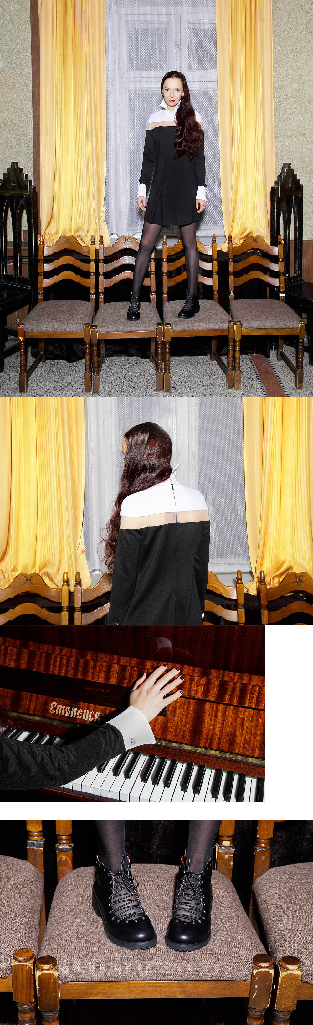 Платье Isabel Garcia я купила в интернете, это прет-а-порте. Мне понравился фасон, необычный формат с монашескими деталями. На свой страх и риск решила заказать и, как не удивительно, оно мне подошло, потому что у меня необычный размер — между ребёнком и взрослым. Ботинки я, можно сказать, специально купила к съёмке. Я люблю небольшой каблук, грубоватую обувь. Это Hermes. Кроме серебряных сережёк я других украшений не ношу, не умею — теряю или ломаю их.
