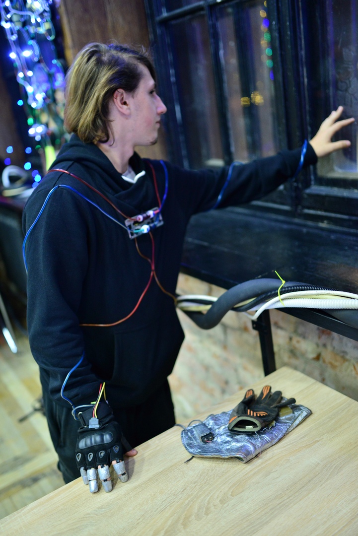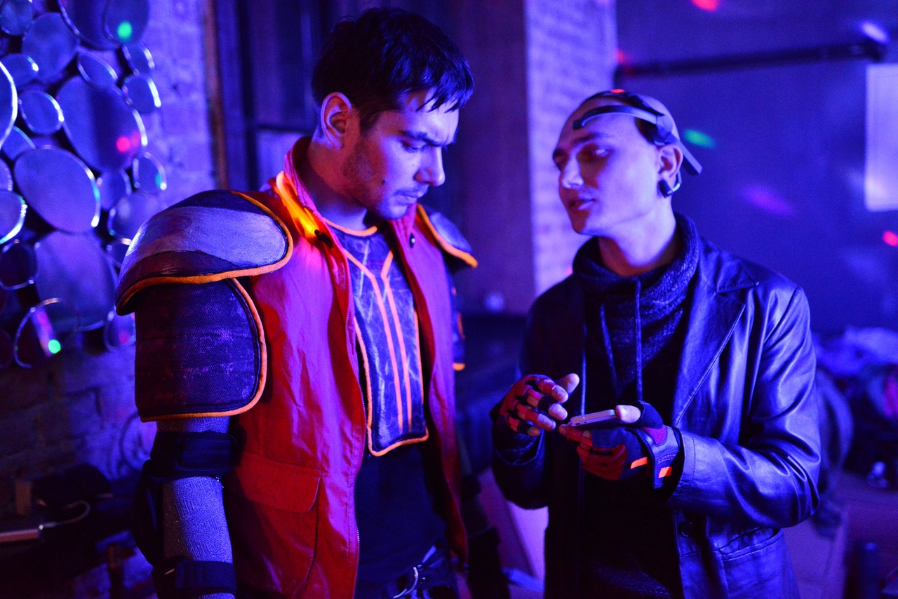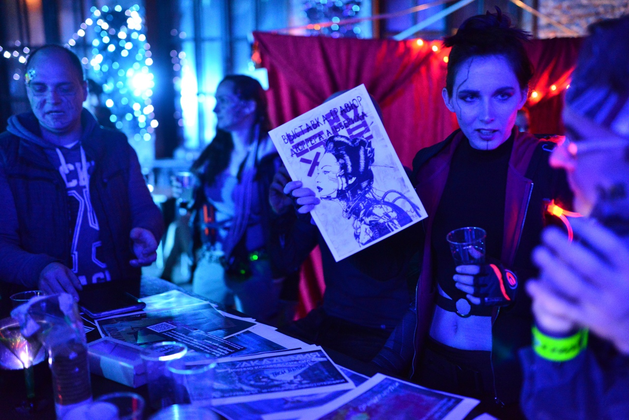 Я не успеваю вписаться в сюжет, и Анатолий выдает мне роль стороннего наблюдателя — репортера Кристен Черри. Каждый должен подготовить на игру костюм в стиле киберпанка и, ну скажем, аксессуары: например, бронежилет или защиту на руки. Если их нет на тебе в реальности, значит их нет и у твоего игрока. Такая же история с оружием, поэтому почти у каждого из 30 игроков в этот вечер игрушечное оружие с пластмассовыми пульками и резиновые ножи. Есть еще подкожная броня, и ее наспех, тут же, рисуют черным карандашом на теле. Некоторые подходят к костюмам более основательно: компания парней сооружает из респираторов, трубок и светодиодов маски; члены армии одного из государств вырезают из светоотражающих лент шевроны; торговец имплантами закрепляет на груди капельницу с трубками, по которым течет жидкость двух цветов. На костюмы идут наушники, внутренние части компьютера.
