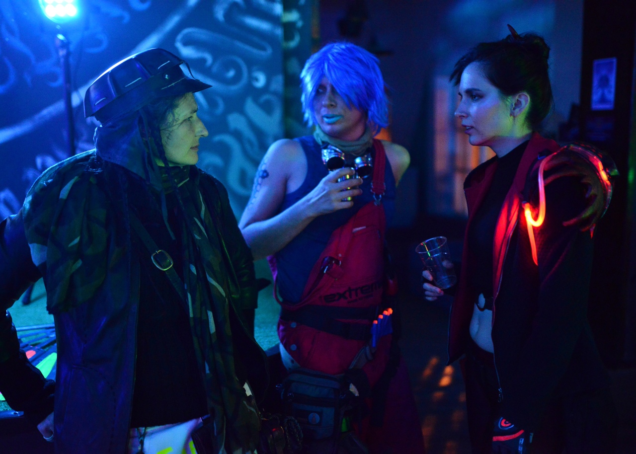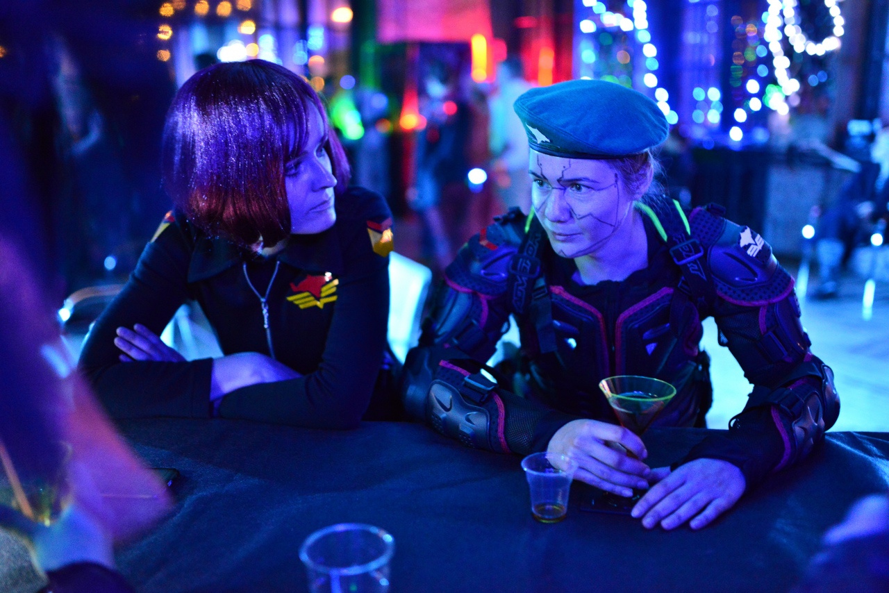 Группа парней со светящимися трубками в черных капюшонах сразу уходит в другой зал. Громогласный парень, похожий на персонажа фильма «Безумный Макс», громко просит диджея поставить музыку и шумно усаживается за стойку, тут же знакомясь с другими посетителями бара.