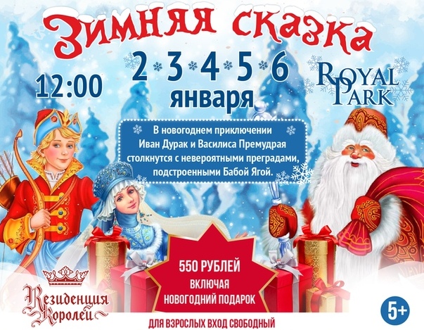 Утренники в детских садах и школах остались позади, но сказочной атмосферы всегда бывает мало. Развлекательный комплекс «Резиденция Королей» со 2 по 6 января готовит в Royal Park для ваших детей новую порцию сказки: захватывающий интерактивный спектакль. 2019-й под угрозой, и спасти его смогут только Иван Дурак, Василиса Премудрая и, конечно же, отважные юные зрители. Заколдованный лес, козням Бабы-Яги и противостояние злым чарам, – каждый ребенок будет задействован в эксклюзивном сценарии, который богат на неординарные режиссерские находки. Входной билет, включающий новогодний подарок, стоит 550 рублей, взрослым сопровождающим – вход бесплатный.