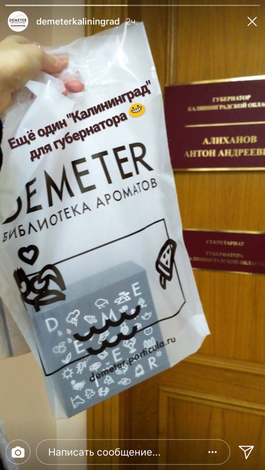 В сторис инстаграма сотрудники местного магазина Demeter фотографировали флаконы аромата рядом с дверями с табличкой с надписью «Губернатор Калининградской области». Пользуется ли Антон Алиханов запахом Калининграда, или купил на подарок, - пока загадка.