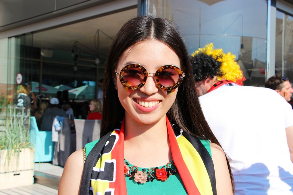 «Я живу в России на протяжении 5 лет, мне нравится эта страна, как и российская сборная по футболу. Следовательно, болею я за нашу сборную и до самого конца буду надеяться. Вы не смотрите на бельгийский триколор у меня на щеках, проходила мимо бельгийцев и, не успев опомниться, те нарисовали у меня свой флаг. С другой стороны, не шибко важно, с каким флагом ты идёшь на стадион смотреть игру. Главное – болеть душой, а не показывать это всем своим внешним видом».