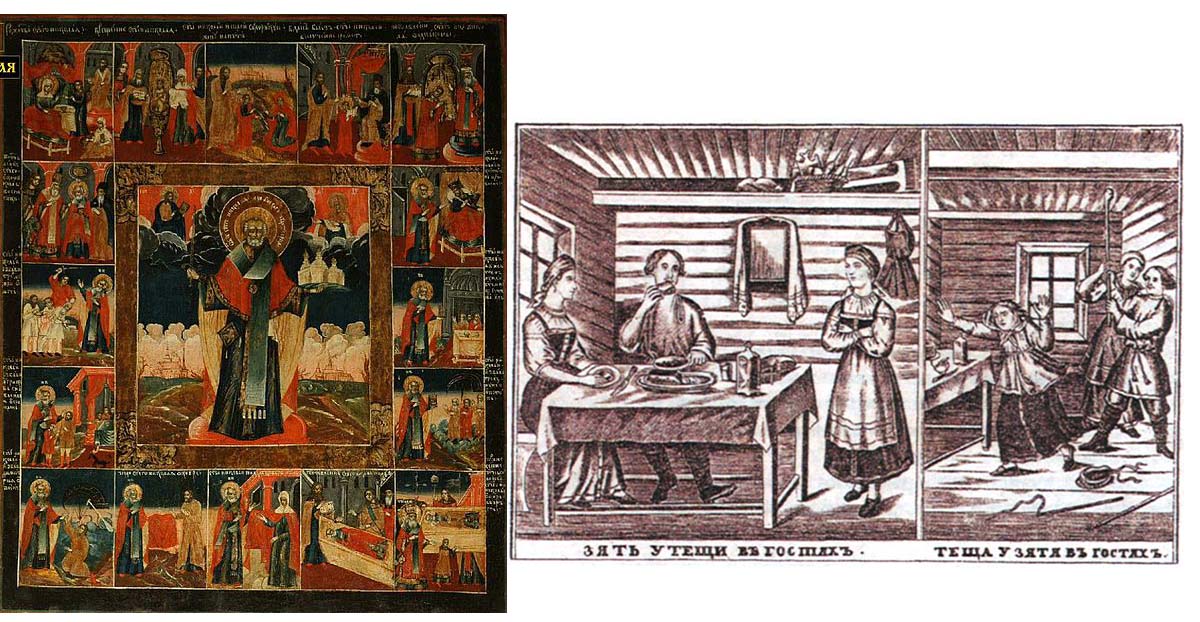 Справа: «Зять у тёщи в гостях. Тёща у зятя в гостях». Лубок. XIX в