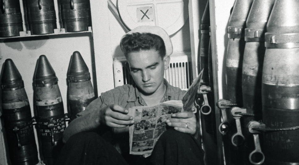 Американский солдат читает комикс, 1943 г. Комиксы про Супермена включали в солдатский паёк для поднятия духа.