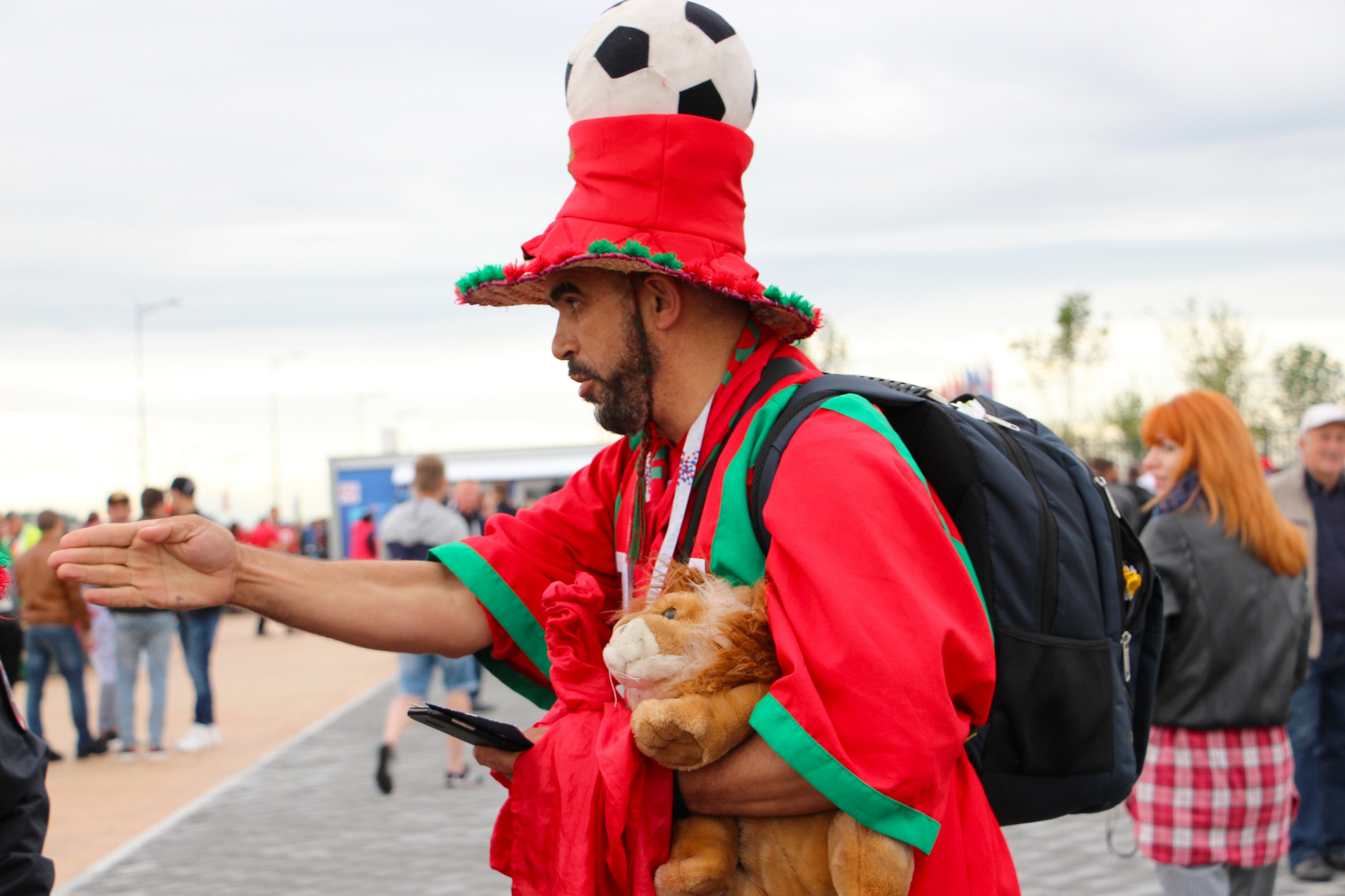 Аудитория возле стадиона собралась разношерстная: тут и гости из Канады, семья мексиканцев, все ещё тусующиеся хорваты и удручённые после провального матча Россия – Уругвай русские. «Марроканцы? Ну, не подведите!» – трясёт кулаком бабушка, обращаясь к компании молодых болельщиков. Те ничего не понимают, но одобрительно кивают.