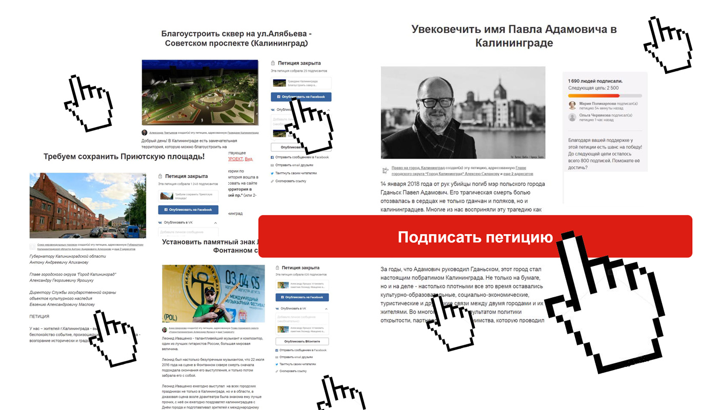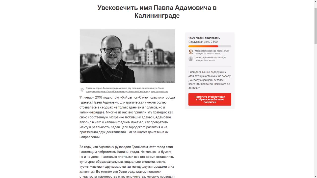 Трагическая гибель мэра Гданьска не только вдохновила калининградцев на написание текстов о значении этого города и его главы для нас, но и инициировала появление петиции с просьбой назвать именем Павла Адамовича одну из улиц в Калининграде. Спустя неделю и 1400 подписей наш мэр Алексей Силанов справедливо заметил: по адресу «Пл. Победы, 1» такая просьба не поступала, а если бы пришла, её направили бы, как и положено по закону, в топонимическую комиссию. Этот казус в очередной раз поставил вопрос: способны ли петиции изменить город? «Твой Бро» решил разобраться