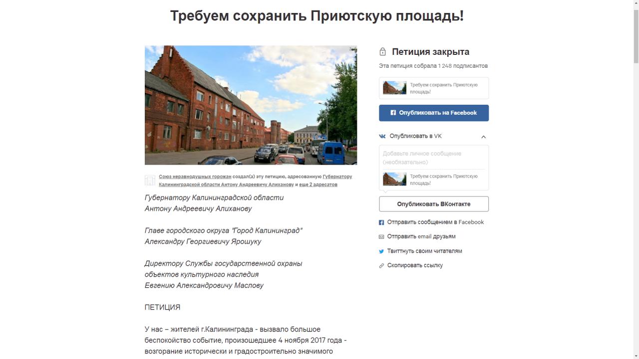 В декабре 2017 года один из инициаторов петиции — архитектор Олег Ли (немного о нём писали здесь) — принял участие в общественном Совете при Областной службе защиты памятников, где рекомендовал властям включить Приютскую площадь в перечень выявленных объектов культурного наследия.