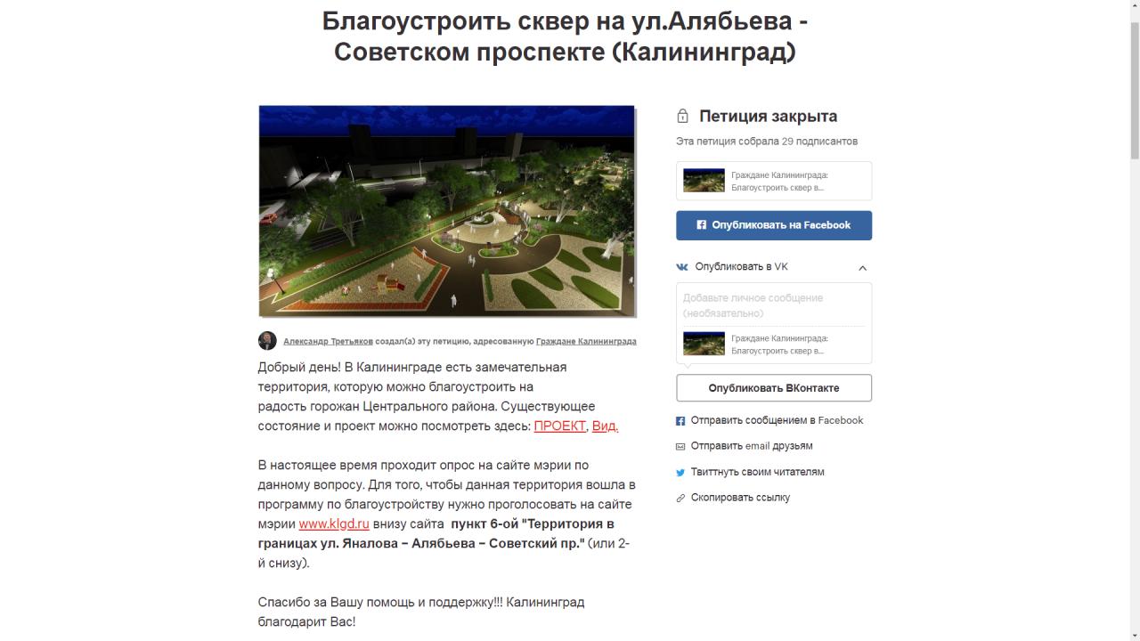 Об этом попросил на Change.org житель города Александр Третьяков. В то время шло голосование на сайте мэрии Калининграда за общественное пространство, которое будет благоустроено за 55 млн рублей в 2018 году в рамках программы «Комфортная городская среда». Петиция собрала всего 29 голосов, поэтому немудрено, что сквер не попал на первые строчки рейтинга. Да и мэрия не изменяет своим привычкам спрашивать мнение людей только на своих площадках: так отдать голос на первом этапе можно было только на сайте мэрии, на втором — в МФЦ. Много ли людей воспользовались этой возможностью, неизвестно. В любом случае требуемого — благоустройства конкретного сквера — не случилось и в ближайшие годы не предвидится.