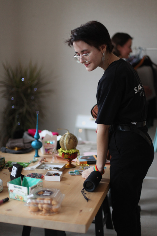 На следующий день к указанному времени приходим по тому же адресу. В дневном свете всё выглядит не так устрашающе. Открываем дверь, заходим, снимаем верхнюю одежду и направляемся в общую комнату. Организаторы встречают нас улыбкой, играет легкая музыка. На столе печенье, на подоконниках свечи, мигают гирлянды. Дружелюбная атмосфера, слышен смех. Девушек 10-15 рассматривают аккуратно сложенные вещи, книги, постеры, аксессуары, крутятся перед зеркалом. Периодически появляющиеся парни смущенно держатся возле пластинок и книг, а спустя минут пять испаряются.