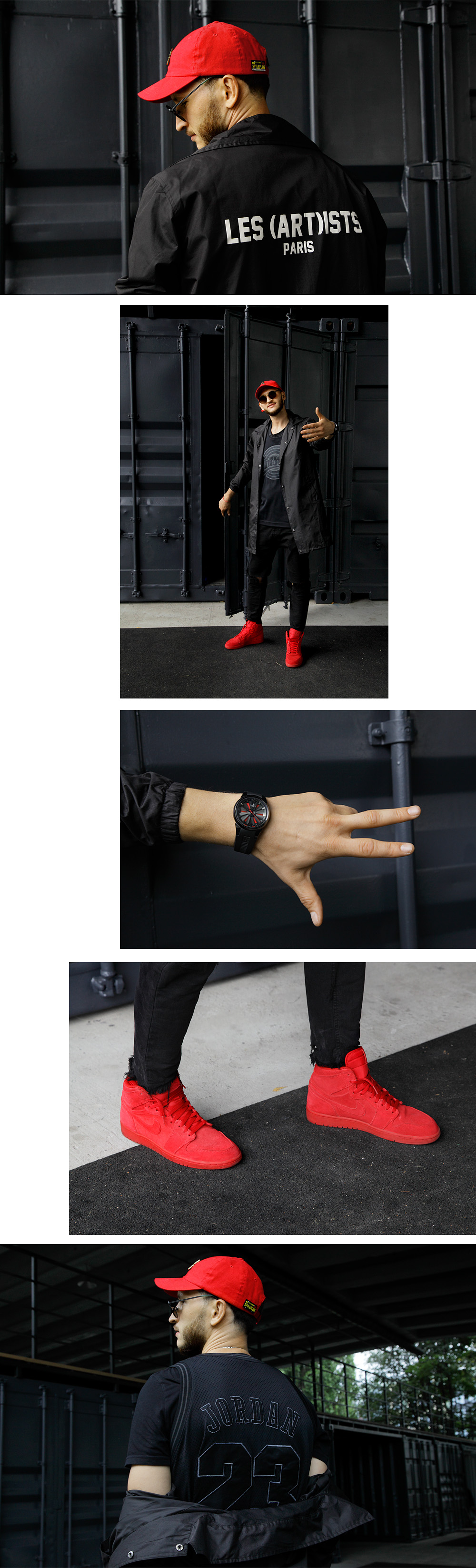 Джинсы Zara я купил в Берлине как раз перед вечеринкой, майка джёрси, вдохновленная фильмом Space Jam. Плащ — от Club Les(Art)ists, кепка — кастом из Лос-Анжелеса, очки — Komono, часы — от швейцарского производителя Perrelet, придумавшего автоподзавод.