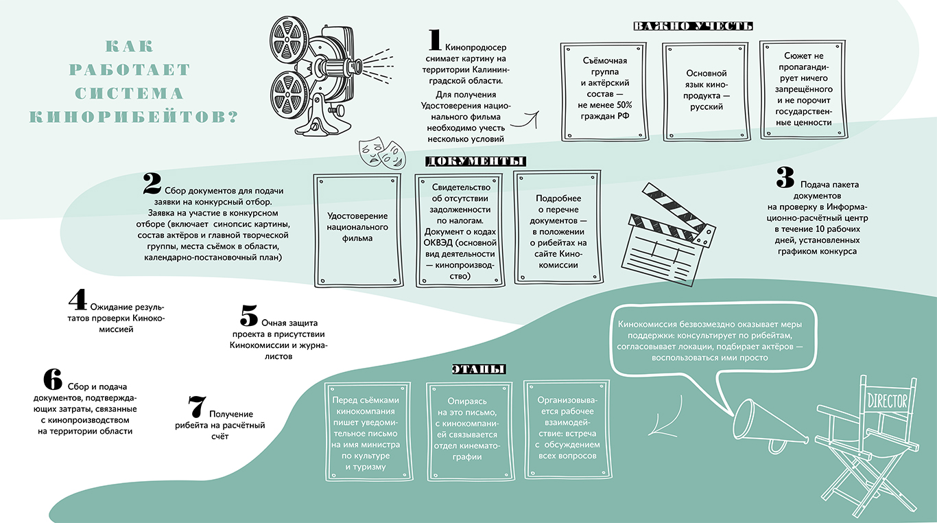 — У нас аргумент достаточно чёткий: кинорибейт составляет 20%, до 40% он увеличен за счёт дополнительных баллов. И чтобы получить даже те основные двадцать, кинопроизводителю нужно инвестировать в пять раз больше. Это серьёзное экономическое обоснование: сейчас на рибейты заложено 40 млн рублей, им предшествует сумма в 200 млн рублей, которая будет потрачена на территории Калининградской области. На мой взгляд, такие деньги весьма существенны для вливания в региональный бюджет, причём по большей части в малый бизнес, потому что именно он обслуживает кинопроизводителей в части проживания, питания, транспортных, экскурсионных и других сопутствующих услуг. Появление таких объёмов денежных средств в бюджете, полагаю, гораздо более положительно влияет на развитие экономики, чем их отсутствие. Насчёт опасений — их нет, единственное — хочется, чтобы быстрее развивалась инфраструктура в части рентала оборудования. Но мы к этому идём эволюционно, кинокомпании заходят, присматриваются, и нас вполне устраивает этот темп. Проекты становятся всё интереснее и интереснее, — объясняет министр.