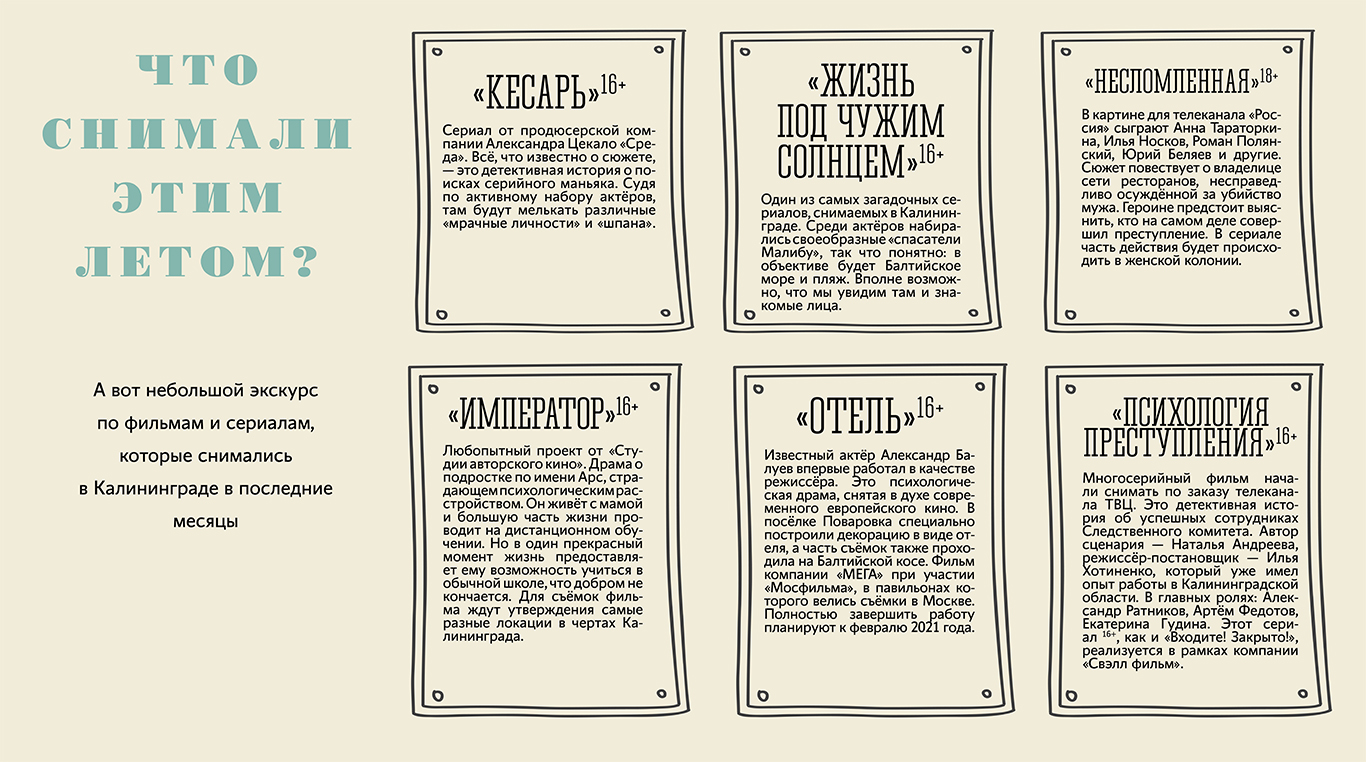 — Когда профи берут наших практикантов — это здорово развивает регион в плане кадров, когда премьера происходит в регионе — это отличная новостная повестка, когда партнёры делают проект в копродакшне с европейской или американской компанией — мы расширяем нашу аудиторию с российской до зарубежной. Всё важно, всё ценно и здорово и уже имеет отклик. В конце августа у меня была встреча по новому продукту, который очень про Калининград, максимально раскрывает туристическую привлекательность. Держим пальчики, что это будет новая «Вики Кристина Барселона»12+, только про наш город, — говорит Каверзина.