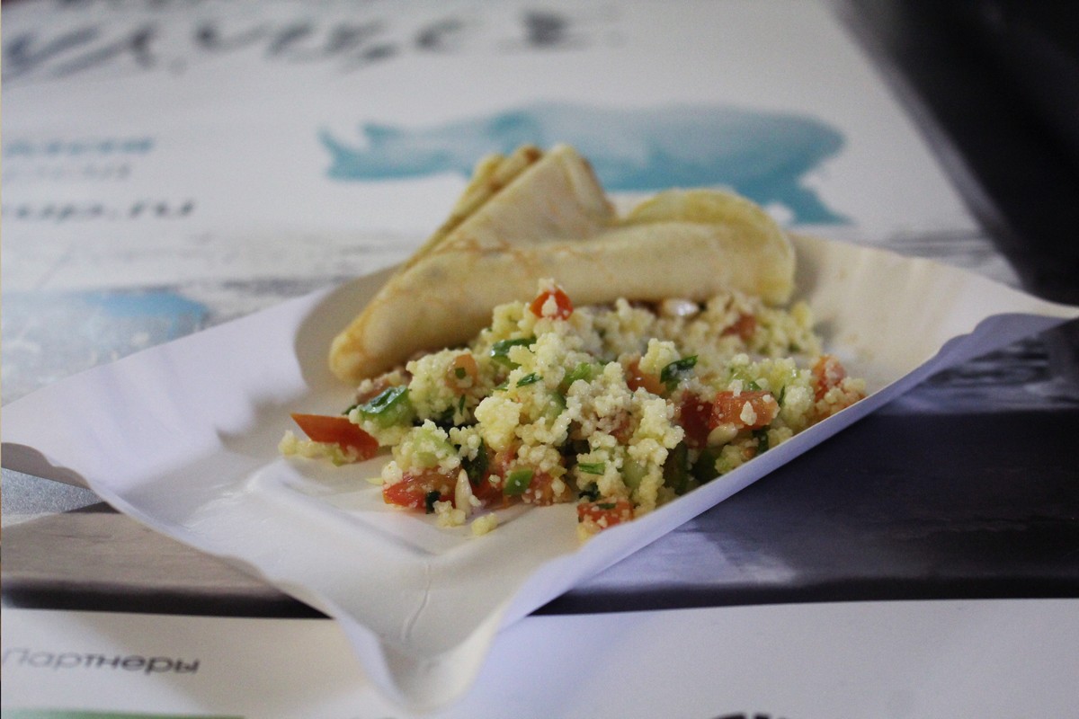 Также шесть видов угощения предоставил специалист по аюрведе и основатель кафе «Высший Вкус» Денис Тайшин. Ему удалось убедить организаторов не отменять ужин, а искать возможные пути решения. И он сам же один из таких предоставил: после рабочего дня в его кафе осталось два вида супа — солянка и минестроне, салат с кускусом и капустный, тушеная фасоль и пряный рис с овощами. И это был фудшеринг в чистом виде, так что участники насытились не только пищей для ума.