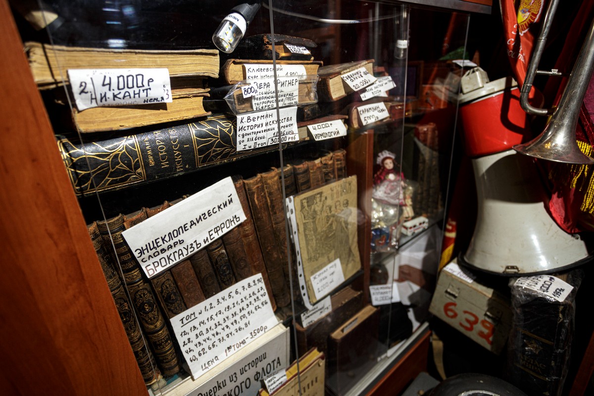 На витрине можно найти коллекцию карманных часов, — те, что с чёрными циферблатами, произведены в Швейцарии по заказу главных злодеев середины 20-го века. Справа от них — ветхие книги: «Атлас мира» 1954 года или «История искусства» 1896 года. Здесь лишь часть из большого списка литературы, которой располагают Людмила Николаевна и её супруг.