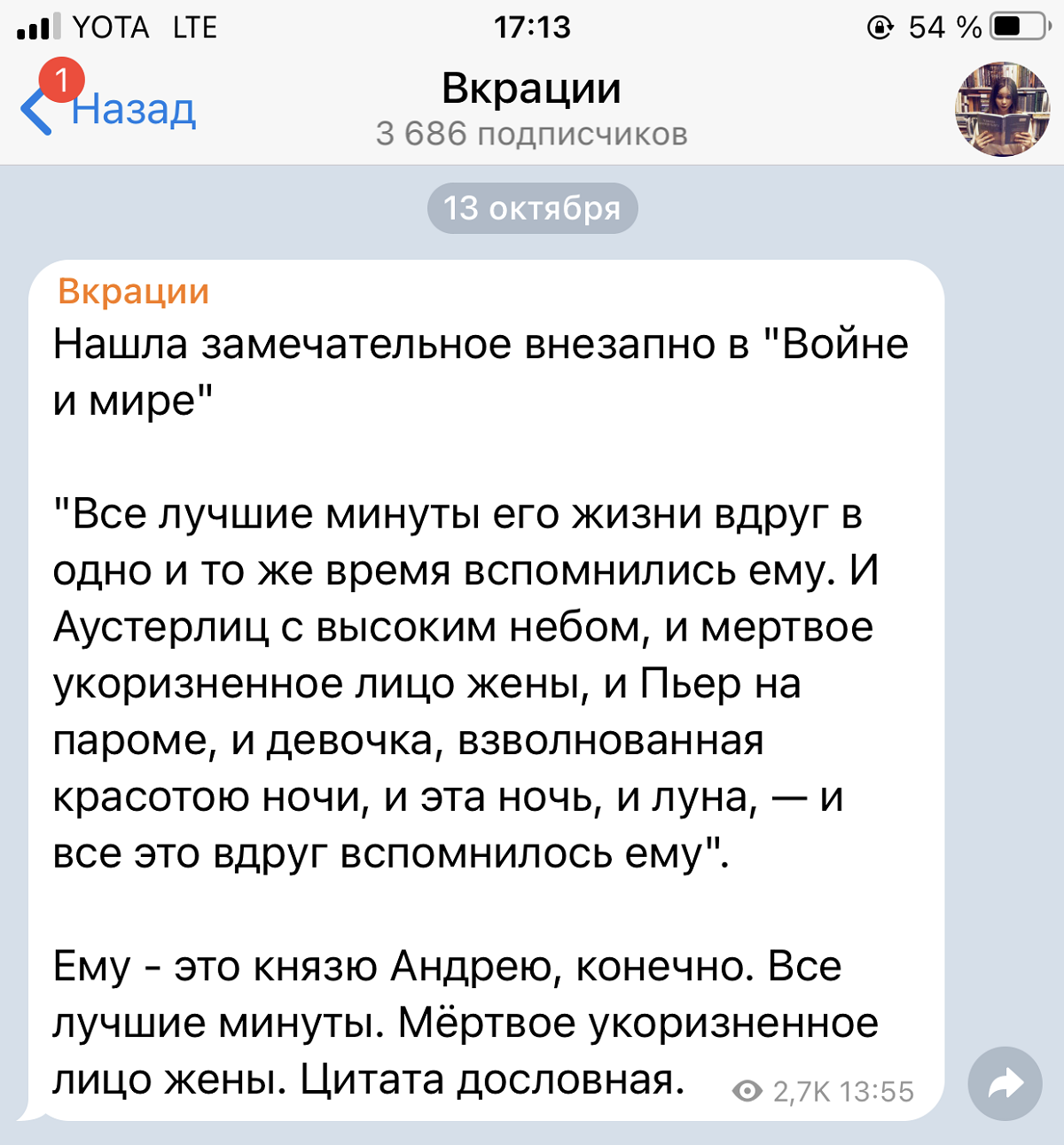 Своими наблюдениями я сначала делилась с окружающими, но это ведь не всем нравится, потому что в основном люди далеки от литературы. Мой молодой человек давно говорил, что я могла бы вести свой Telegram-канал. Тогда мне это казалось сложным и времязатратным занятием. А потом однажды в отпуске читала чужие каналы и поняла: настал тот момент, когда можно создать свой.
