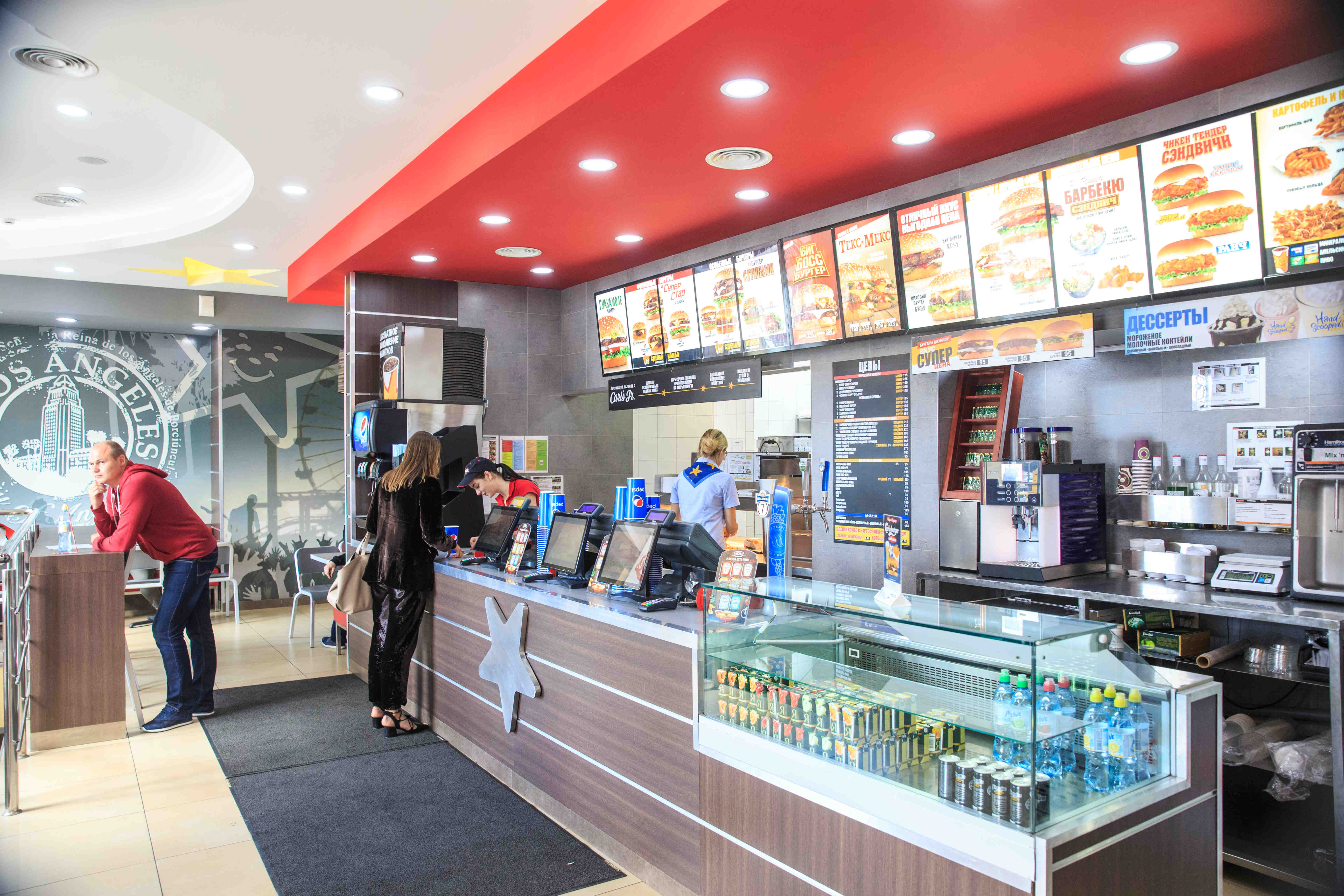 Франшиза калифорнийской бургерной Carl’s Junior появилась в Калининграде еще в прошлом году. Закусочная открылась в здании Калининградского делового центра на площади Победы. За первые несколько месяцев Carl’s Junior получил репутацию бургерной, где вкусно, быстро и не дорого. Именно с такой мыслью мы туда и отправились. Внутри кафе оформлено в стиле традиционного американского фаст-фуда: огромные светящиеся баннеры с меню, стойка с небольшими холодильниками, автомат для напитков и множество столиков, разбросанных по залу. Есть и второй зал, более просторный, в него ведет широкая лестница, уходящая вниз.