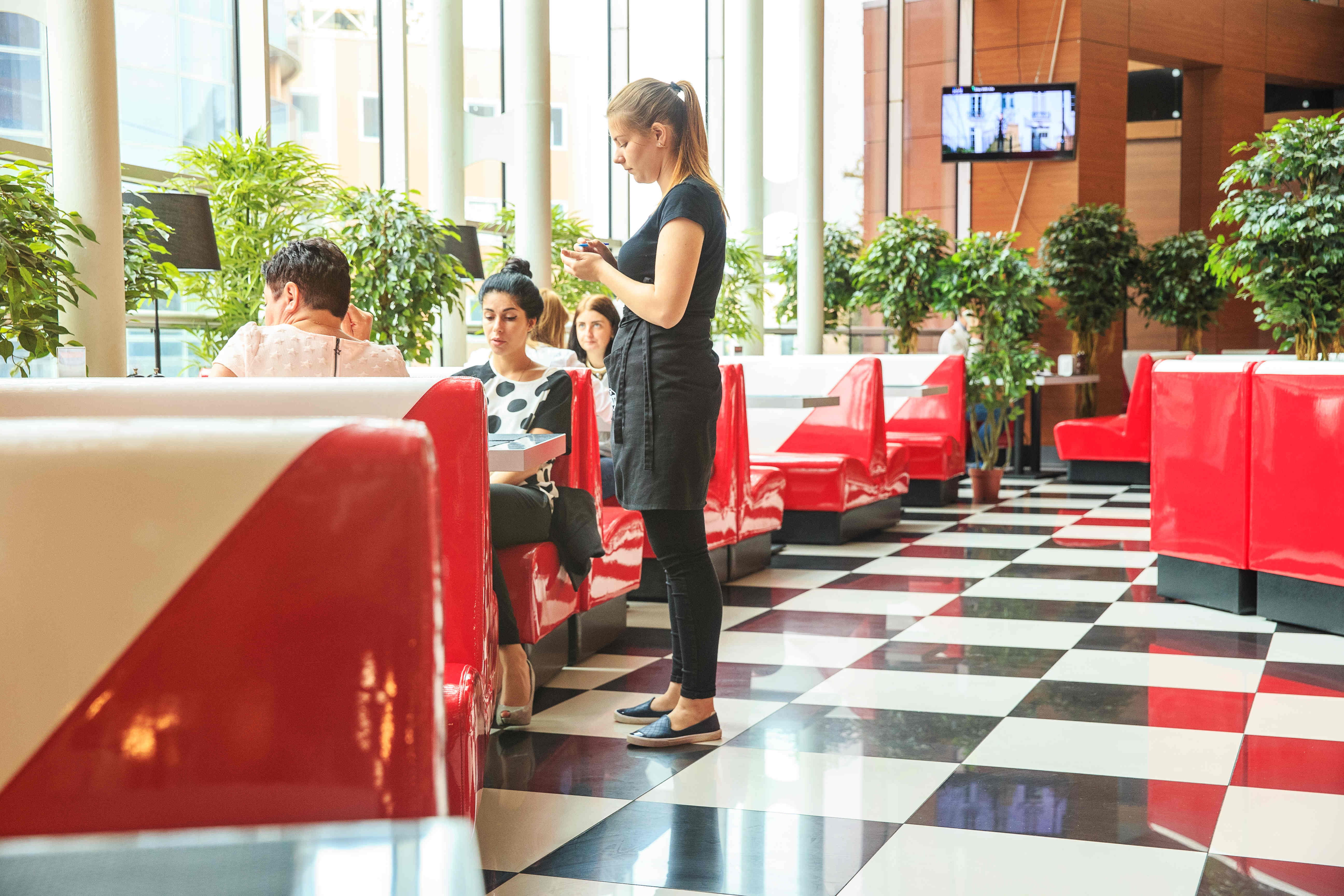 Мы оказались в закусочной в обеденное время — несколько подростков и мамы с детьми уплетали гамбургеры за металлическими столами, но ажиотажа не наблюдалось. В меню несколько видов бургеров с котлетами из курицы и говядины. Помимо классических вариантов внимание привлекает гуакамолебургер с одноименным соусом или бургер с грибами. Однако половины из предложенного в наличии на кухне не оказалось, и мы выбрали классический чизбургер и вестернчизбургер, о чем сообщили девушке за стойкой. Она с улыбкой нас выслушала, оформила заказ и выдала большой металлический значок с номером.