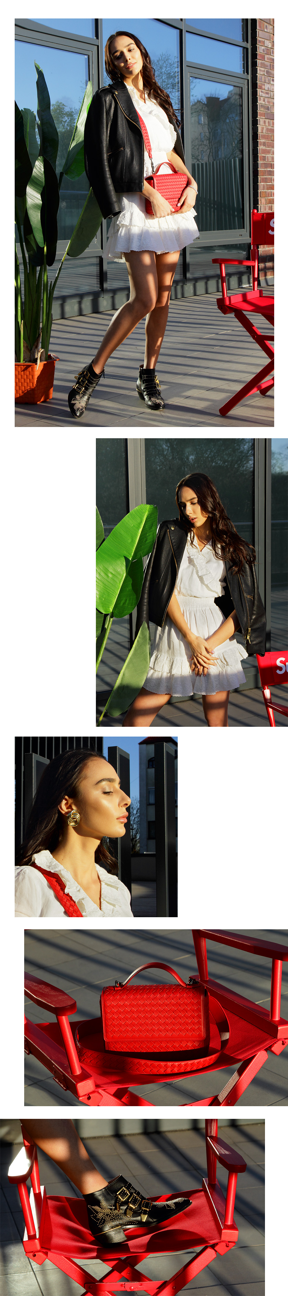Ботинки Chloe купила на Farfetch. Красная сумка Bottega Veneta — подарок от моего мужчины, дополняет образ и придаёт ему яркости. Сережки Bulgari — подарок мамы.