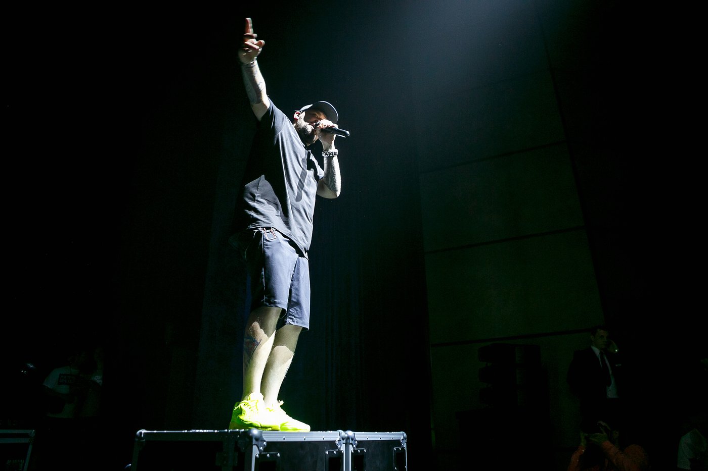 Спустя пару минут после того, как «Твой Бро» оказывается в заполненный до отказа зале, свет гаснет. Из партера этим вечером убраны кресла, и здесь просторно, несмотря на огромное количество зрителей, но заполнены также весь амфитеатр и весь балкон под самым потолком. После непродолжительного громкого «интро» к вышедшим на сцену барабанщику, бэк-эмси и девушке-диджею добавляется сам Василий; вечер мигом стартует с взрывной исповедальной «Это дороже денег». Песни вроде этой – типичный Баста: прочитанный с интенсивностью отбойного молотка монолог «по душам» и рефлексия по поводу творческого и жизненного пути. Замечательный звук в «Янтарь холле» позволяет разобрать каждую строчку из тех, что выпаливает под надвинутой черной кепкой Баста. Отыграв первую композицию, он шутит про то, что шоу в театре эстрады стартует в 17.30 («Зато у вас весь вечер свободен!») и подтрунивает заходящих в зал опоздавших («Долго не могли припарковаться? А надо пешочком ходить!»).