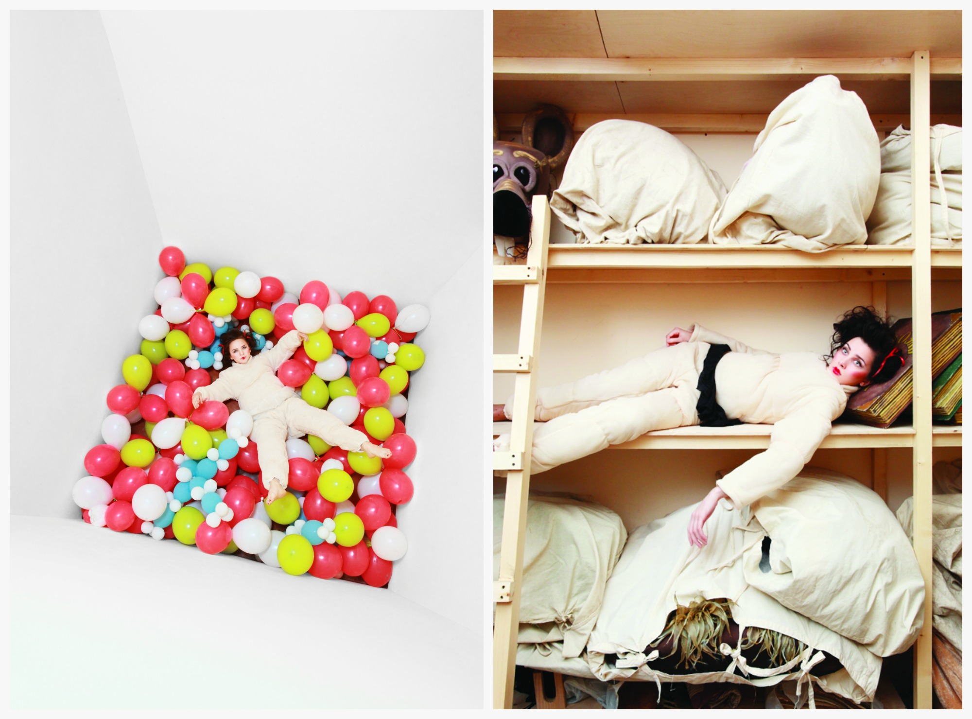 «Это съемка в театре кукол. Снимали для материала о театре танца «Инклюзы», которого больше не существует. Все было как всегда - поискал место, фактуру, стали снимать их в образах кукол. Там, где девушка лежит в шариках, - это на лестнице в театре. Я просто насыпал там шариков и сказал ей лечь туда».