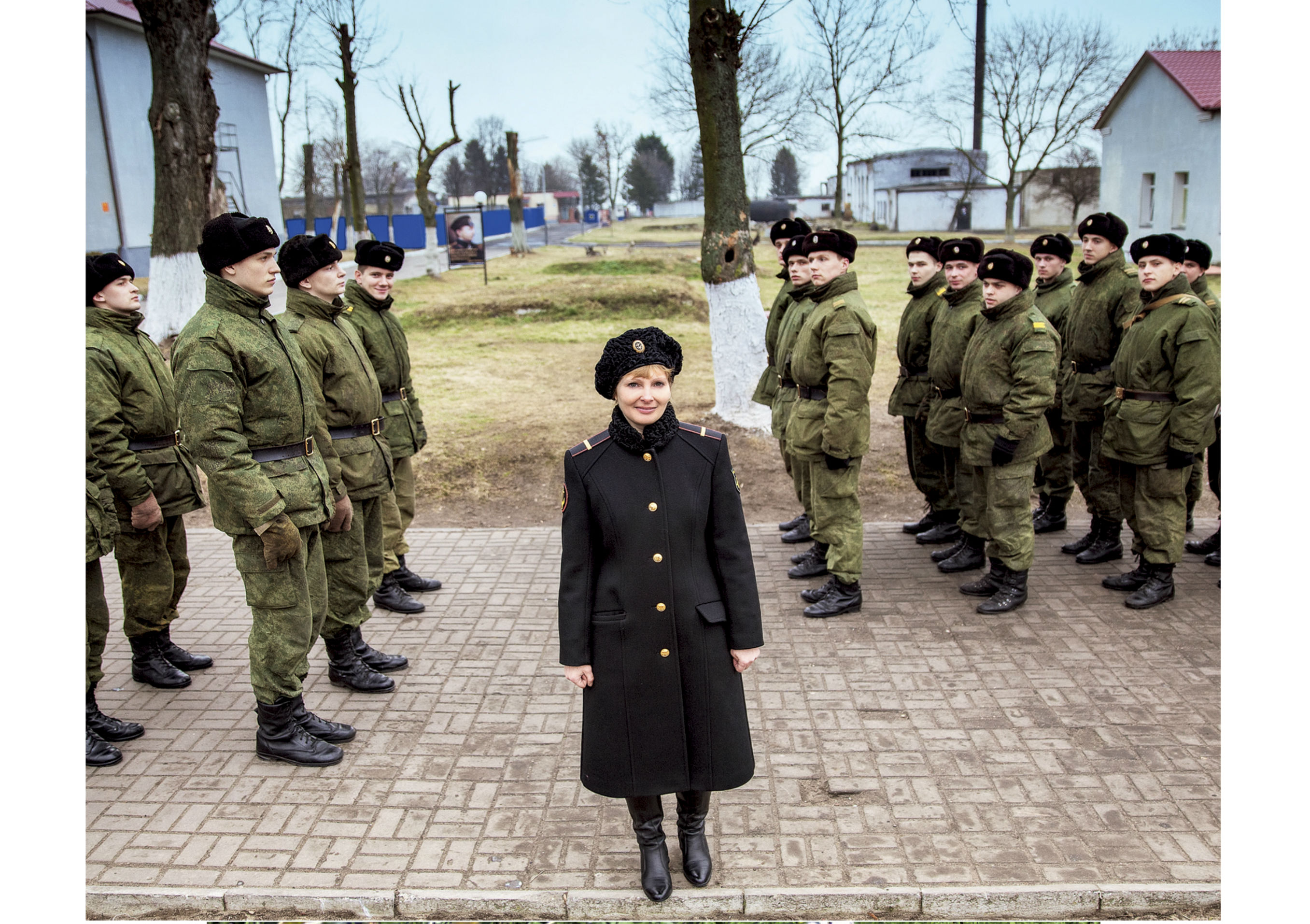 «Эта фотография была сделана для темы номера, посвященной 23 февраля. Мы поехали в часть морской пехоты в Балтийск снимать женщин-военнослужащих. Это фото было сделано около столовой. Помню, что было дико холодно. В какой-то момент фотограф стал брызгать креативом и решил снять женщину на фоне кучи солдат. Мы очень долго их ждали - они были на обеде. Потом выстроили их, и уже я начала командовать солдатами, в духе: «Третий ряд, второй молодой человек, голову левее; первый ряд, солдат, не сутультесь!» Весело было».