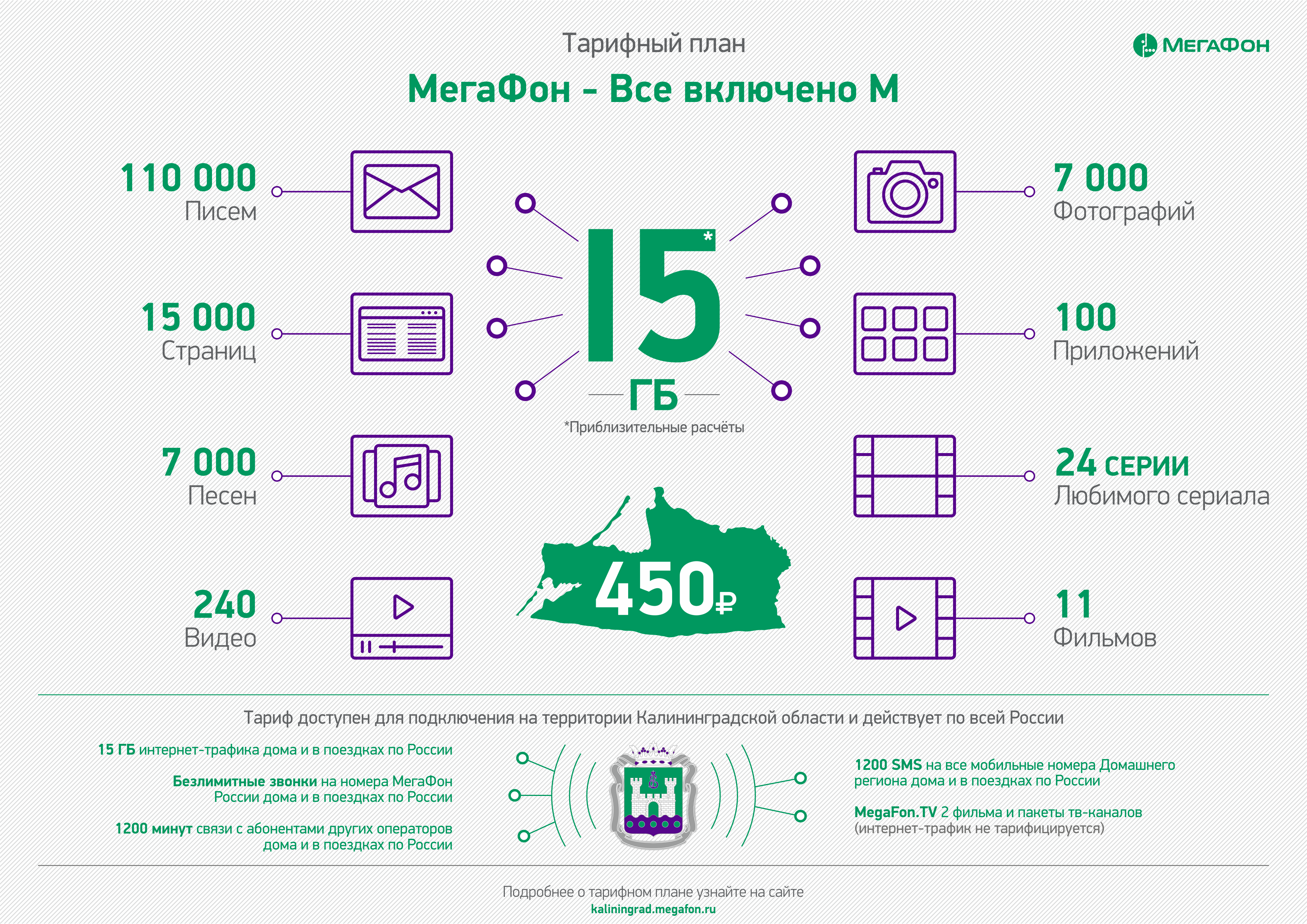 Оценить по достоинству тарифный план «Всё включено - М» сможет, разумеется, не только победительница конкурса, но и все жители Калининградской области. В обновлённом тарифе пакет интернет-трафика, минут и SMS увеличился почти в 2 раза. Абоненты «МегаФона» могут общаться с абонентами со всей России 1200 минут, а также отправлять до 1200 SMS и пользоваться мобильным интернетом – в пакет включено 15 ГБ (!) трафика за ежемесячную абонентскую плату 450 рублей, которая осталась без изменений.