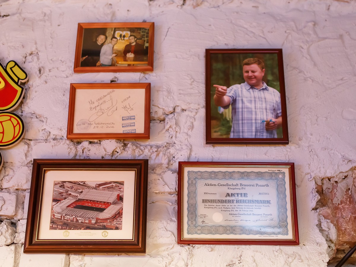 Артефактами мы потихоньку обрастаем. В статье на газетной вырезке под стеклом наш главный момент в XX веке – гол Сульшера в дополнительное время «Баварии» в финале Лиги чемпионов 1998/1999. «Манчестер Юнайтед» победил тогда со счетом 2:1. Рядом в рамке - настоящая акция пивоваренного завода «Понарт», мы купили их две штуки у антикваров. Одну подарили совладельцу компании «Понарт» Ринату Путятинскому, а одну повесили у себя. Ее номинал - 100 дойч марок, датирована акция 1942 годом. Получается, что как раз война вовсю фигачит, а у них там акции, видите ли.