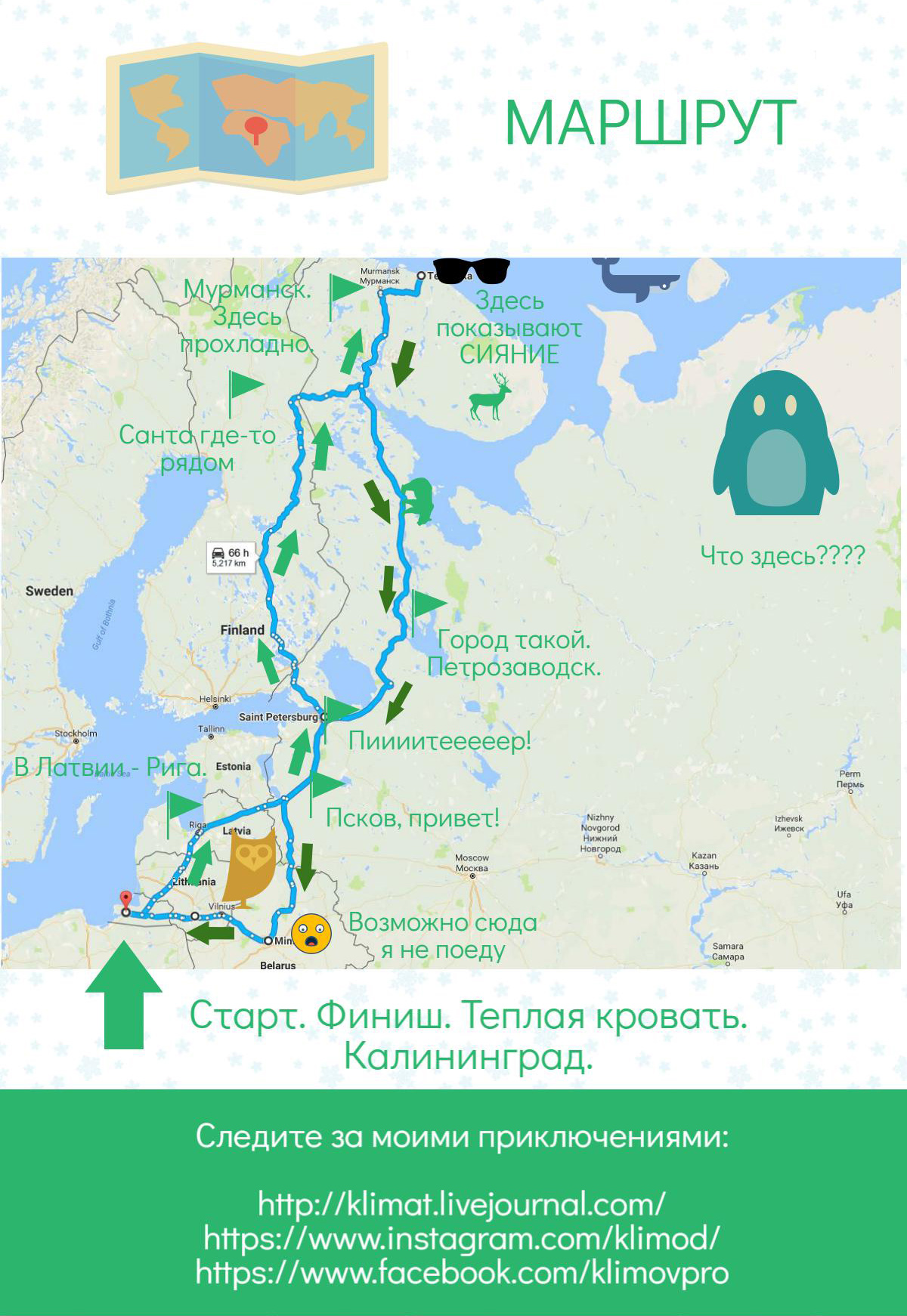 Стартовав с самой западной точки России, он едет через Литву и Латвию, тусуется в Пскове, куражит в Питере, знакомится с Сантой в Финляндии, мерзнет в Мурманске, катается на сноуборде в Кировске, бежит от медведей в Калерии, ищет моря в Петрозаводске... И где-то между этими точками, скорее всего в прославленной звягинцевским «Левиафаном» Териберке, охотится за северным сиянием.