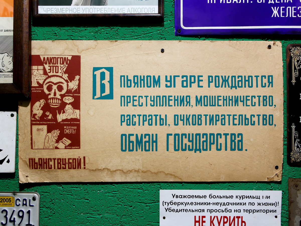 Это табличка про пьяный угар и объявление о комсомольском собрании, посвященном «Свободе Африки» и заседанию по поводу строгого выговора за неуплату членских взносов.