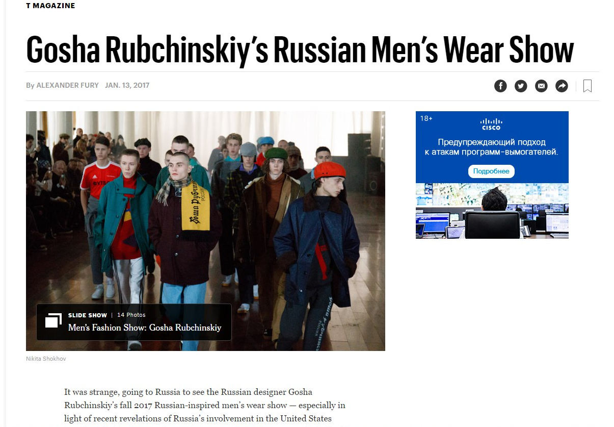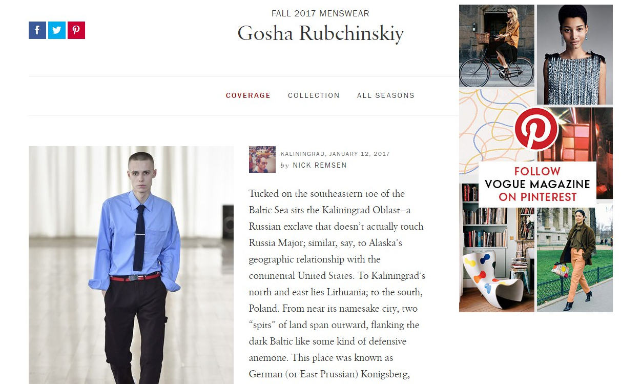 «Довольно странно отправляться в Россию, чтобы увидеть вдохновленную Россией коллекцию «Осень 2017» российского дизайнера Гоши Рубчинского - особенно в свете последних откровений о вовлеченности России в президентские выборы в США. Но это странно и в смыслах моды. Рубчинский не стал давать шоу в блестящей, одержимой стилем Москве или в живописном Санкт-Петербурге, но выбрал шероховатый прибрежный город Калининград, столицу российского эксклава между Польшей и Литвой, который был захвачен Красной Армией в 1945-м. Возможно, идея русской победы была в сознании Рубчинского - ведь Калининград также будет одним из городов проведения Чемпионата мира ФИФА в 2018-м.