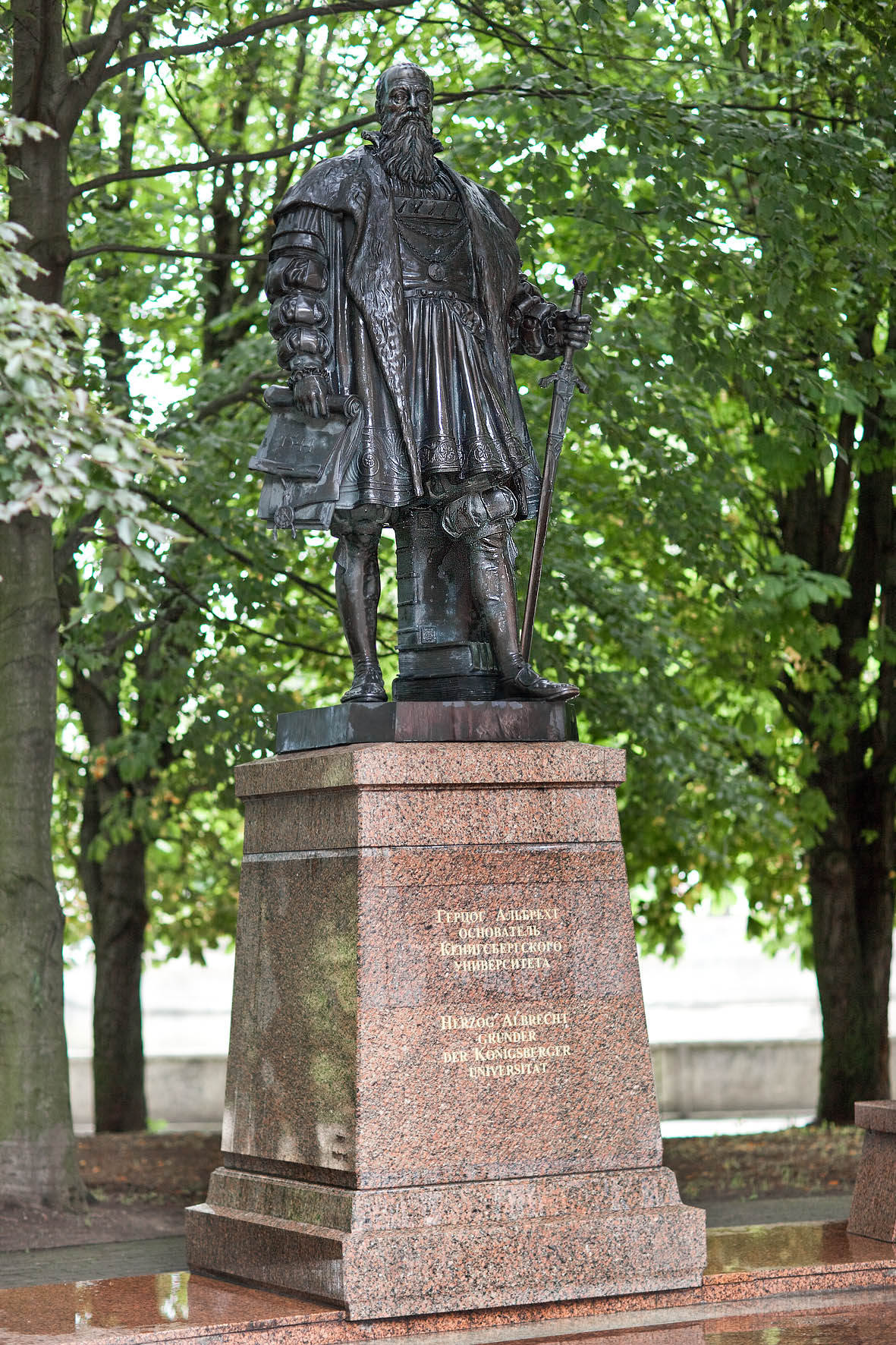 К 750-летнему юбилею города новый памятник герцогу Альбрехту установлен около Кафедрального собора. Это реконструкция работы Ф.Ройша, которую выполнил калининградский скульптор Фёдор Алексеевич Мороз. Памятник отлит в «Кузнице на Печатной» на средства, собранные немецкими общественными фондами. Надпись на пьедестале теперь гласит: «Герцог Альбрехт, основатель Кёнигсбергского университета». Место для памятника выбрано с учетом положения первого здания университета – оно находилось в северо-восточной части острова, за спиной бронзового герцога. Взгляд основателя университета направлен к северной стене Собора, около которой покоятся профессора и главный гений Кёнигсберга – Иммануил Кант.