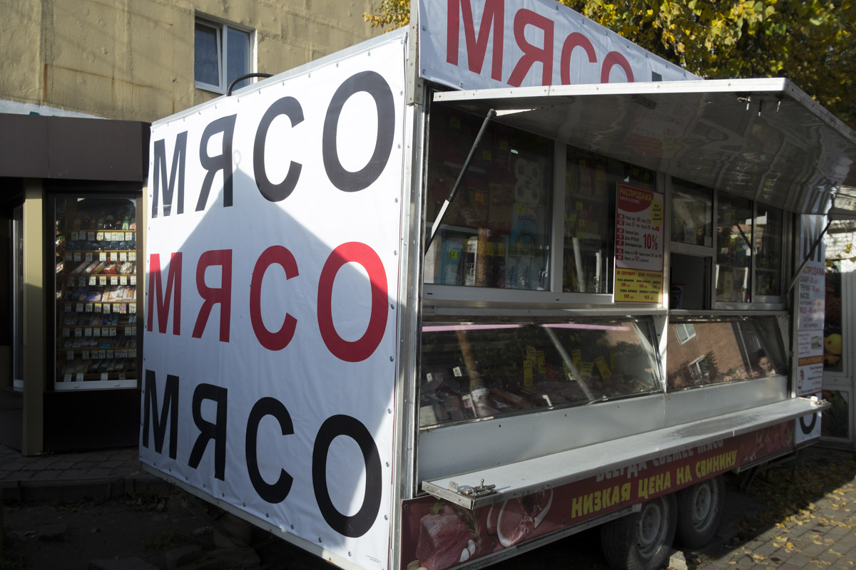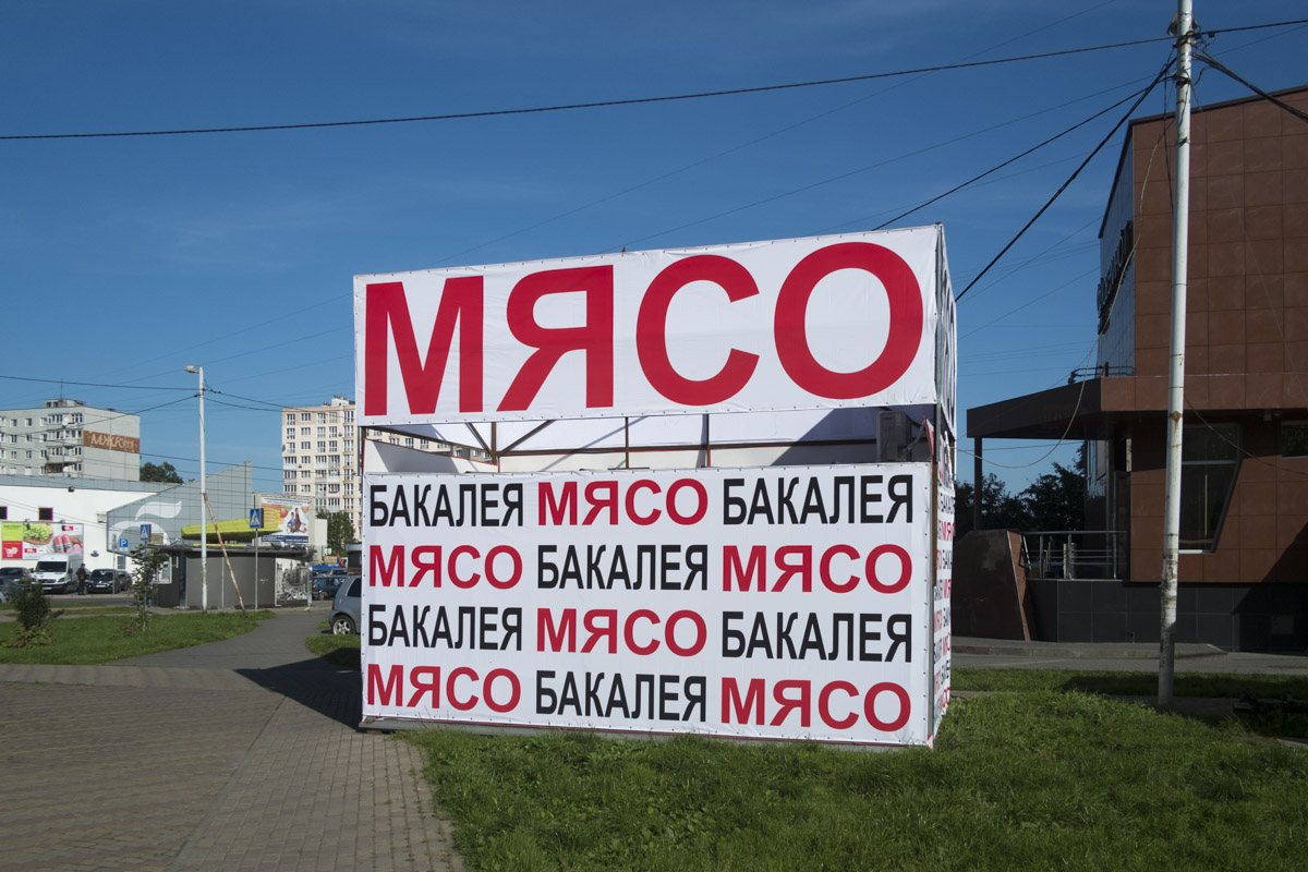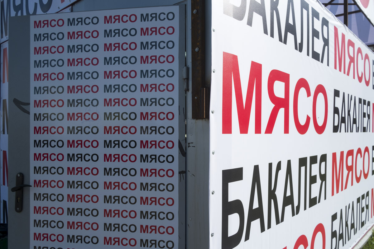 Мы пришли и просто попросили макет либо черно-белый, либо красно-черный с акцентом на «Мясо». В разных размерах, да и все, в принципе. Просто, чтобы понимать, как это будет смотреться. Были различные макеты: были «Продукты», «Бакалея», «Мясо». На разных палатках попробовали по-разному. Где-то написано «Мясо», а вот на улице Озерной, к примеру, по всей палатке написано слово «Продукты». И мы сейчас с этим тоже экспериментируем, потому что зачастую, когда мы мониторим мнение покупателей, слышим: «Ой, я не пойду в это место, потому что там только мясо». Мы поэкспериментировали и сделали «Продукты». Люди идут, людям интересно, ну а там будет видно. Как говорится, потребитель покажет. Сейчас у нас уже, по-моему, 33-й проект заканчивается, мы его на следующей неделе доделаем.