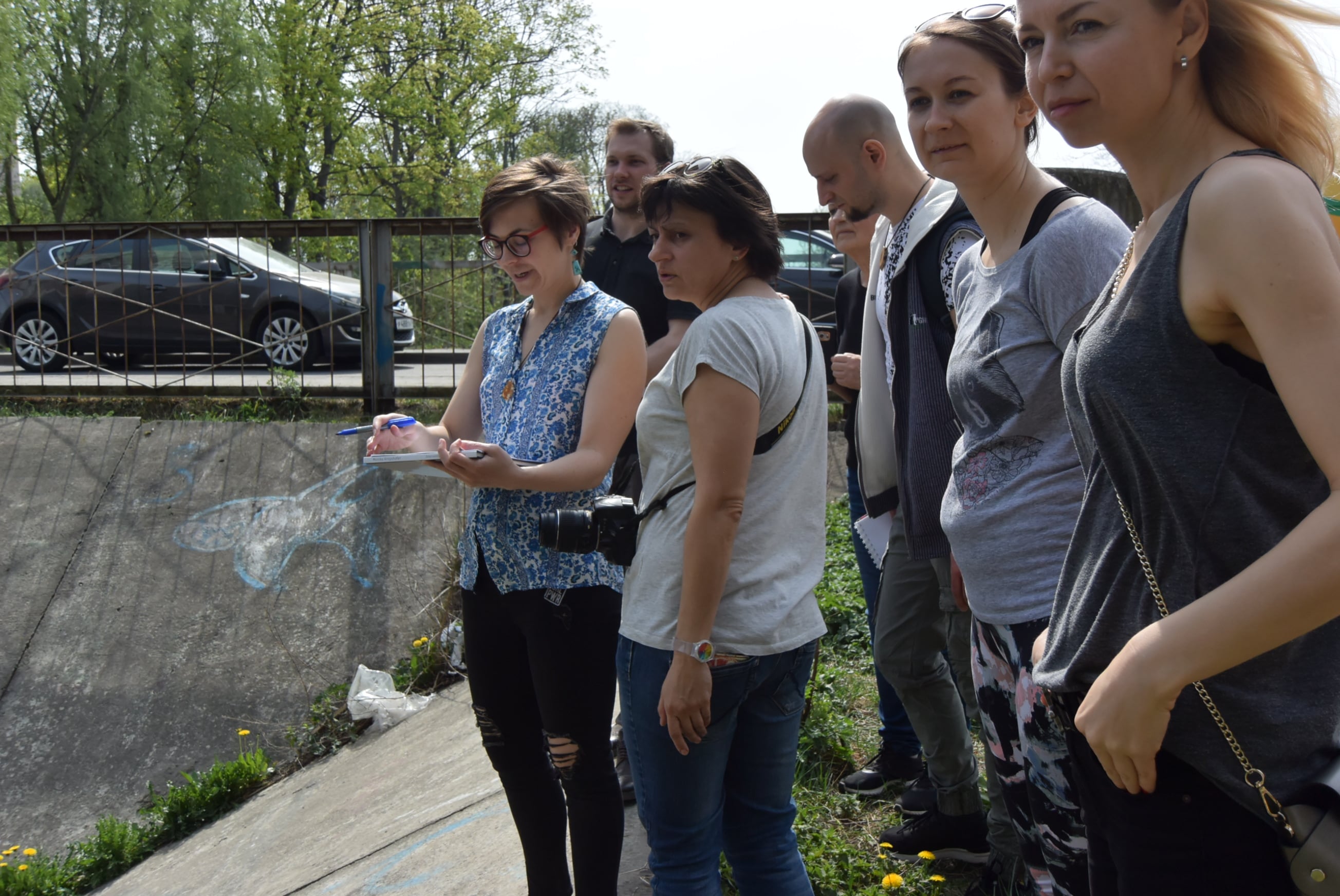 «В ходе мастерской мы картировали больше 10 потенциальных точек для интервенции - берега ручья, лужайки, стены домов, бетонные склоны дамбы у моста через ручей. Здесь живут люди, которым хочется отдыхать, гулять, но на лужайках негде посидеть, ручей не ухожен, замусорен, бетонные стены навевают скуку, которая провоцирует протест в виде вандальных надписей и рисунков».