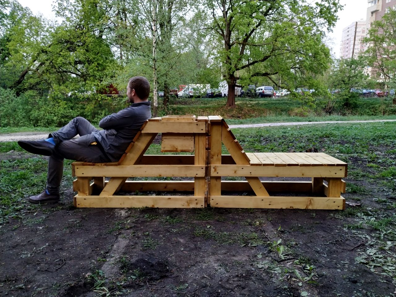 Команда под руководством петербургского дизайнера Антона Пуренкова трудилась над изготовлением лавочки. По замыслу, лавочка состояла из модулей, а потому обладала ценным качеством — способностью быть модифицированной под запросы пользователей. Пользователи, однако, распорядились иначе — через несколько дней после мастерской лавочка пропала. Что ж, на чьем-то дачном участке определенно стало комфортнее.