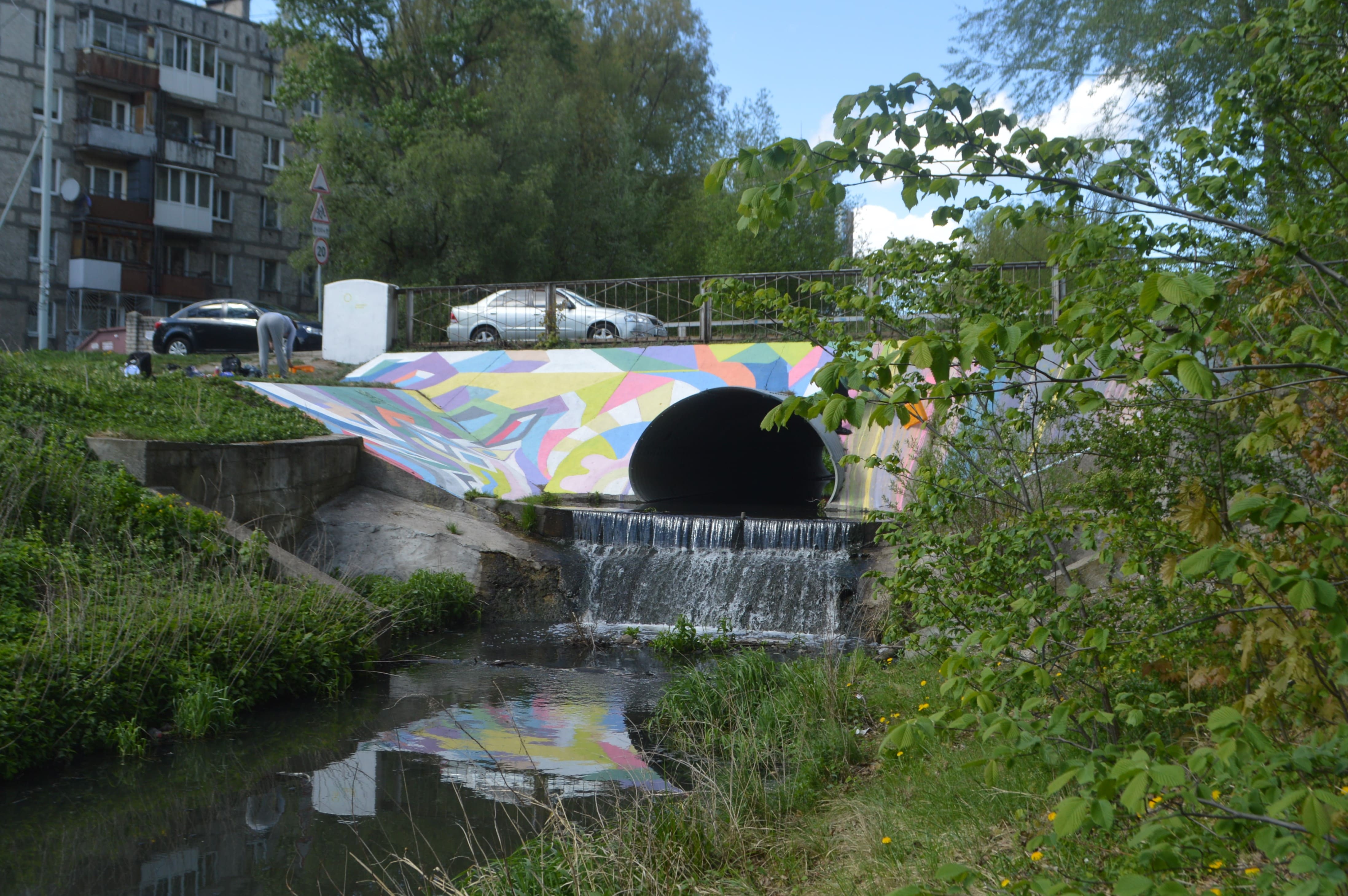 «Для работы наша группа выбрала мост через Крепостной ручей — захотелось что-то сделать с обрамляющими ручей унылыми и серыми бетонными плитами, «украшенными» нецензурщиной. Вокруг было много мусора, в том числе и в воде. Пришлось хорошенько прибраться, прежде чем начать рисовать. Уже просто очищенный от бутылок, пакетов и другого мусора ручей с небольшим водопадом похорошел. А наш разноцветный рисунок помог добавить ярких красок и создать хорошее настроение. Место просто «заиграло»! Было очень радостно наблюдать за результатом.