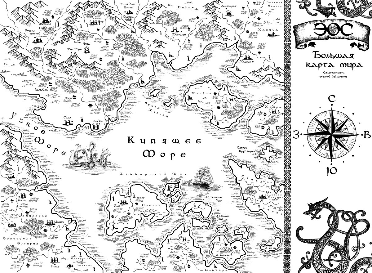 К самой первой книге, «Голос Уручи», я готовился полгода, а написал за два месяца. Она стала хорошей пробой пера, но во многих моментах оказалась сыровата — не хватило практики. Нужно было начитать базу фэнтези-литературы и вообще найти идею, о чём писать. Когда идея наконец пришла ко мне, первым делом я нарисовал карту. Всегда начинаю с нее, иначе мне тяжело: если я не вижу местности, то фантазия не работает. Я погружаюсь в вымышленную Вселенную, вижу происходящее, а потом уже рождается история. Вот Толкин сначала придумывал языки, а потом всё остальное, а моя любовь — карты. Когда смотрю на них, возникает ощущение, что это окошко в другой мир.