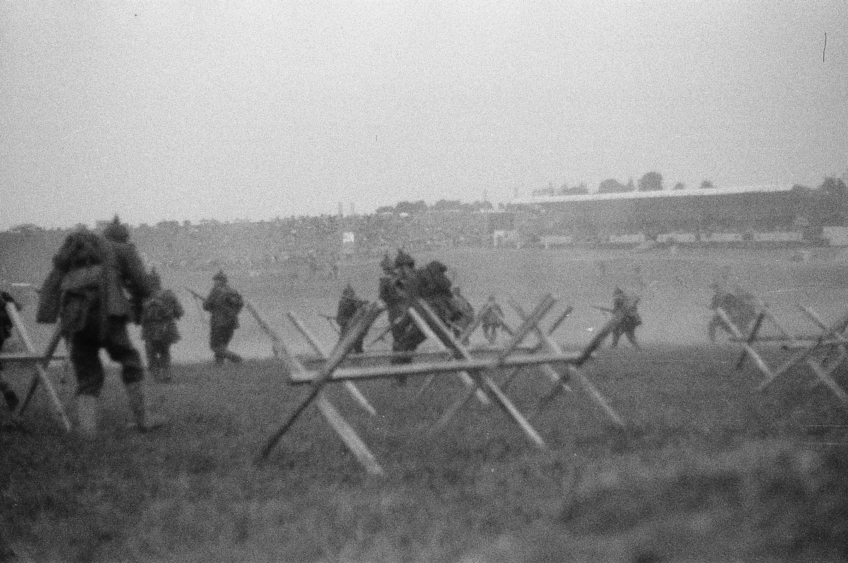 Не знаю, как вся баталия смотрелась со стороны зрителей, но с нашей стороны впечатления были на высоте. Буквально перед самым началом пошел дождь, и, быть может, кому-то из зрителей он и подпортил картину боя, но только не нам. В один момент вырытые окопы раскисли от грязи. Был даже момент, когда я, вскочив на бруствер, понял, что он рушится под моим весом, и я обратно скатываюсь по грязи в окоп. Сразу же похолодало, особенно у земли, мокрая трава усложняла перемещения, дым «резал» глаза.